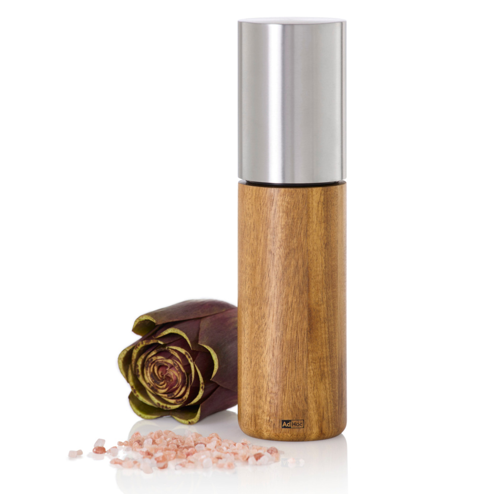 Zastosowane w urządzeniu żarna CeraCut® są wydajne, odporne na korozję i zużycie. Żarna nie chłoną zapachów, dzięki czemu zawsze możesz cieszyć się czystym, niczym niezakłóconym aromatem przypraw. Dodatkowo młynek posiada szeroki, płynny zakres regulacji grubości mielenia od drobnego proszku do grubych kawałków. Zastosowany system CAP ułatwia zdjęcie głowicy i pozwala na łatwe napełnianie młynka. Młynek jest dostępny w kilku rozmiarach. Produkt został zaprojektowany przez AdHoc Design Team. Aby napełnić młynek należy zdjąć górną część delikatnie zsuwając ją z trzpienia. Zaleca się unikać obracania żarnami podczas wykonywania tej czynności, aby nie doprowadzić do ich uszkodzenia. Po zdjęciu górnej części młynka możliwe jest napełnienie pojemnika na przyprawy. Nie zaleca się ubijania przyprawy wewnątrz pojemnika. Do swobodnego zamknięcia młynka niezbędne jest pozostawienie odpowiedniej ilości miejsca w pojemniku na przyprawy. Szczególną uwagę należy zwracać na czystość przypraw. Pewne zanieczyszczenia mogą doprowadzić do uszkodzenia żaren. Dolne pokrętło służy do regulacji grubości mielenia. W celu uzyskania bardziej rozdrobnionej przyprawy należy obracać pokrętłem zgodnie z ruchem wskazówek zegara, a gdy przyprawa powinna być zmielona grubiej należy obracać pokrętłem w przeciwnym kierunku do ruchu wskazówek zegara. Przed przystąpieniem do regulacji konieczne jest sprawdzenie czy pomiędzy żarnami nie zalega przyprawa, mogąca blokować regulację. Uwaga: Nigdy nie miel, jeżeli zbiornik na przyprawy jest pusty, może to doprowadzić do uszkodzenia żaren!