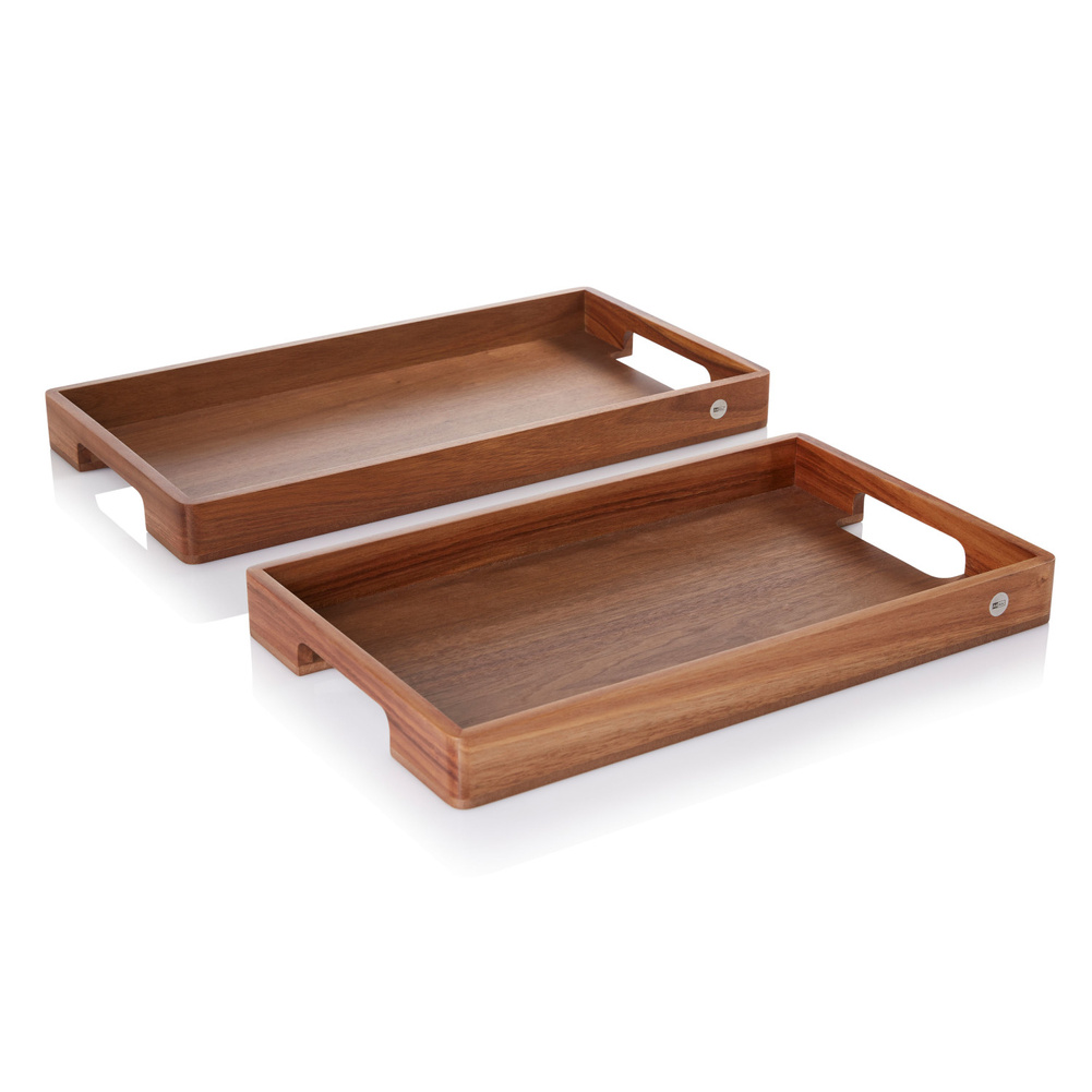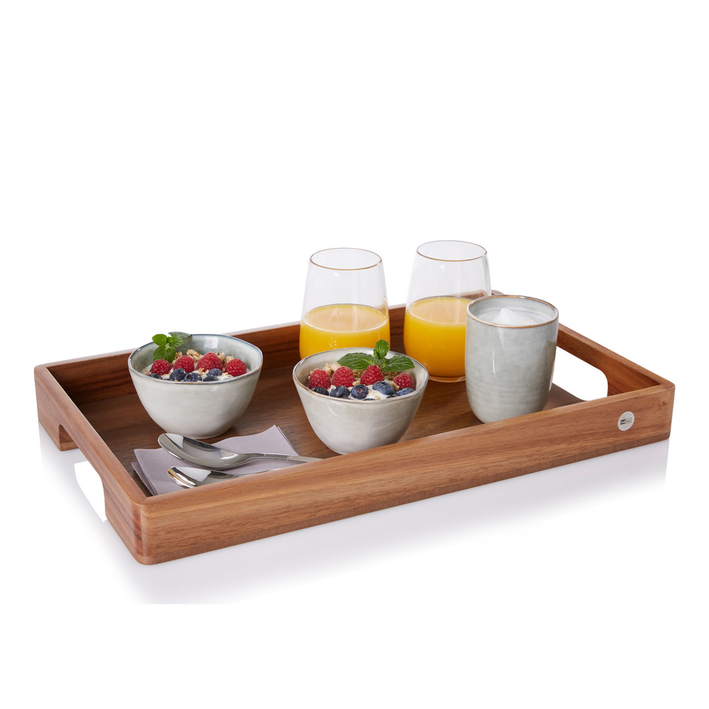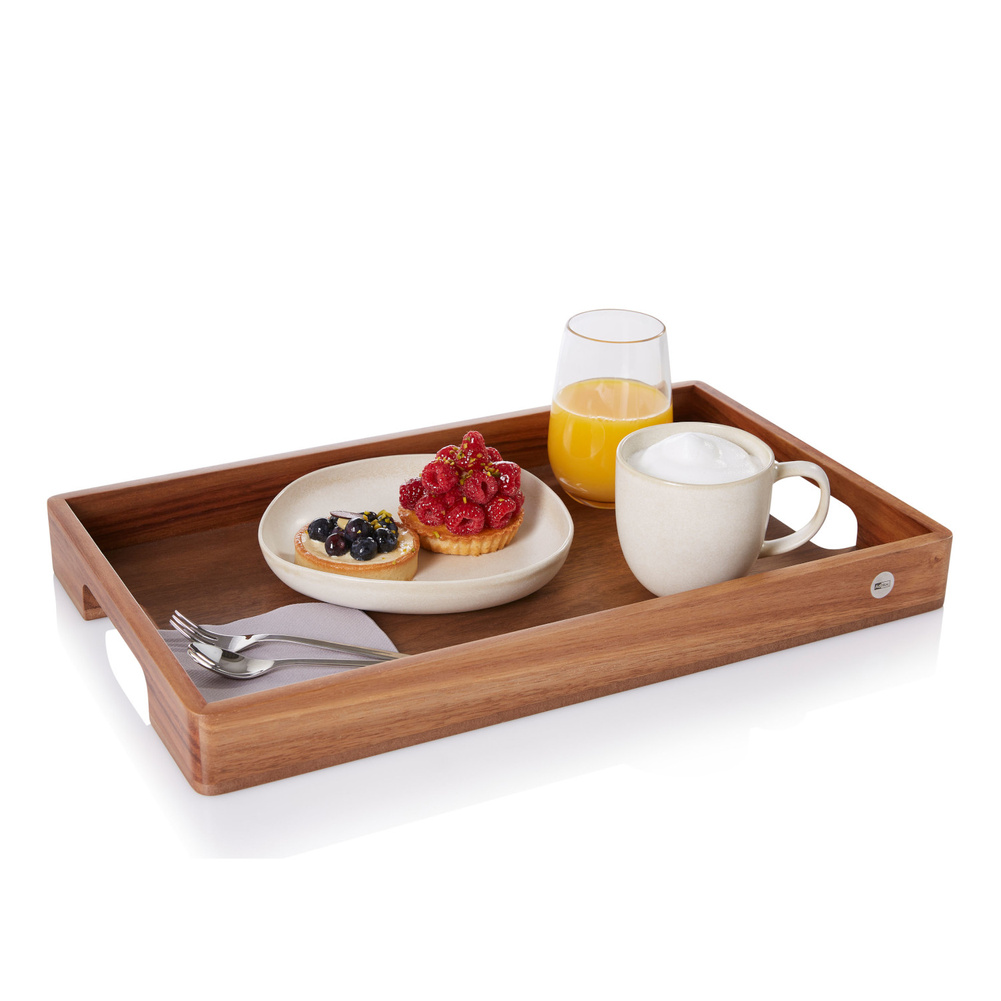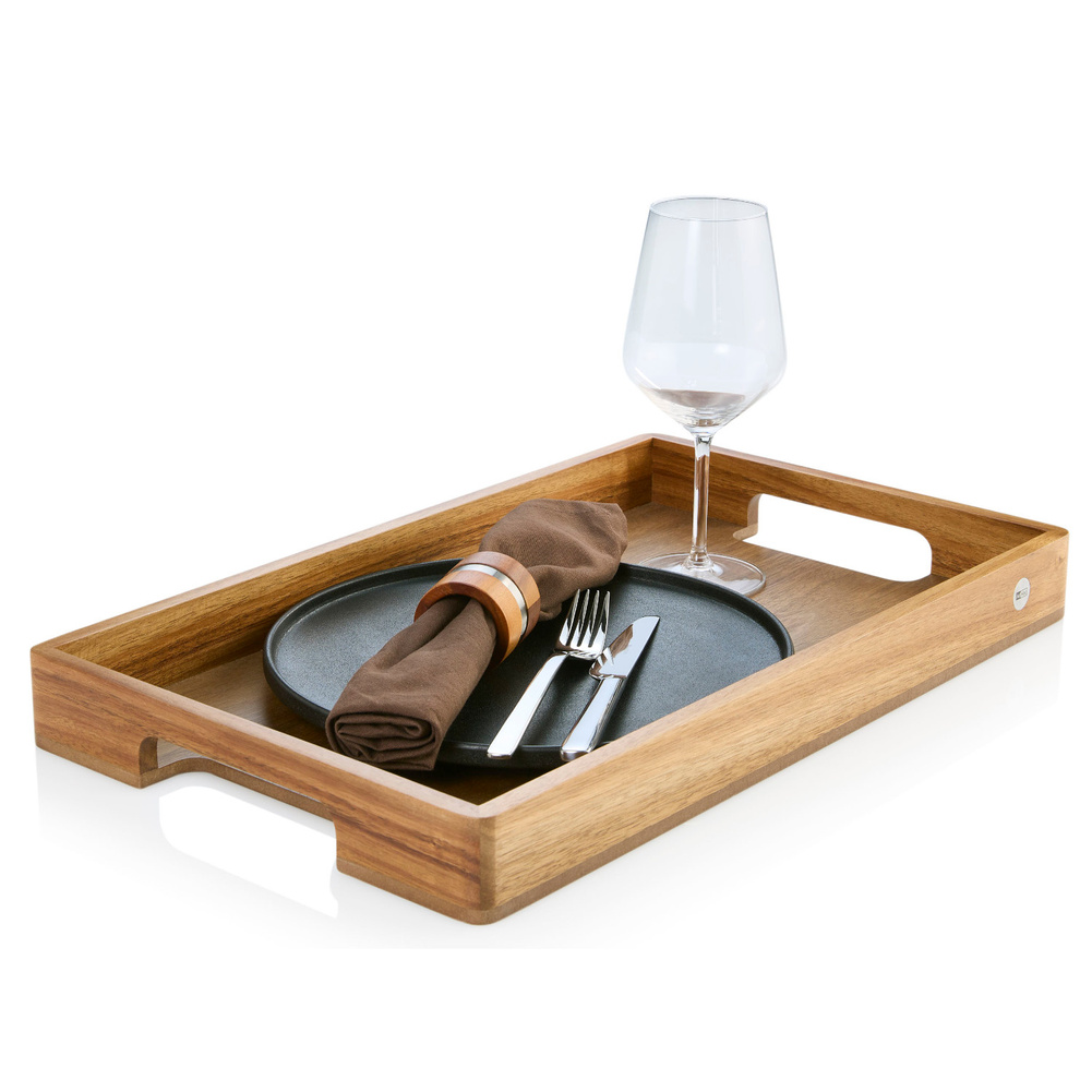 Elegancka taca pomieści talerze o średnicy do 28 cm, a także świetnie nadaje się do serwowania herbaty lub kawy z różnymi dodatkami. Taca pięknie prezentuje koloryt naturalnego drewna a wysokie boki skutecznie zabezpieczają transportowane naczynia. Taca z obu boków ma szerokie wycięcie umożliwiające przenoszenie. Dodatkowy komfort dają zaokrąglone krawędzie. Produkt został zaprojektowany przez AdHoc Design Team. Materiał: boki - drewno akacjowe, spód - płyta w okleinie z drewna orzechowego. Opakowanie: brak.Bezpieczeństwo - rodzaj ostrzeżenia