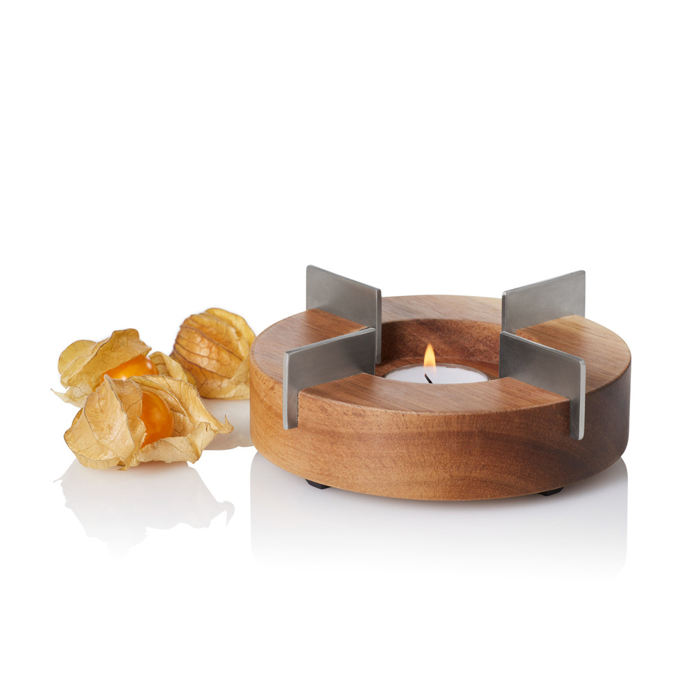 Podgrzewacz jest przeznaczony do podtrzymywania temperatury kawy lub herbaty i idealnie prezentuje się z imbryczkiem Fusion. Sprawdzi się również przy utrzymywaniu temperatury jedzenia w miskach, zapewniając im stabilną podstawę. Połączenie drewna akacjowego ze szczotkowaną stalą nierdzewną nadaje podgrzewaczowi charakteru i elegancji. Cztery silikonowe nóżki utrzymują podgrzewacz w miejscu, zabezpieczając przed przypadkowym ześliźnięciem się z blatu. Podgrzewacz należy czyścić wilgotną, miękka ściereczką. Nigdy nie należy zanurzać w wodzie. Nie należy myć w zmywarce. Produkt został zaprojektowany przez AdHoc Design Team. Materiał: drewno akacjowe, stal nierdzewna, silikon. Opakowanie: kartonowe pudełko prezentowe.