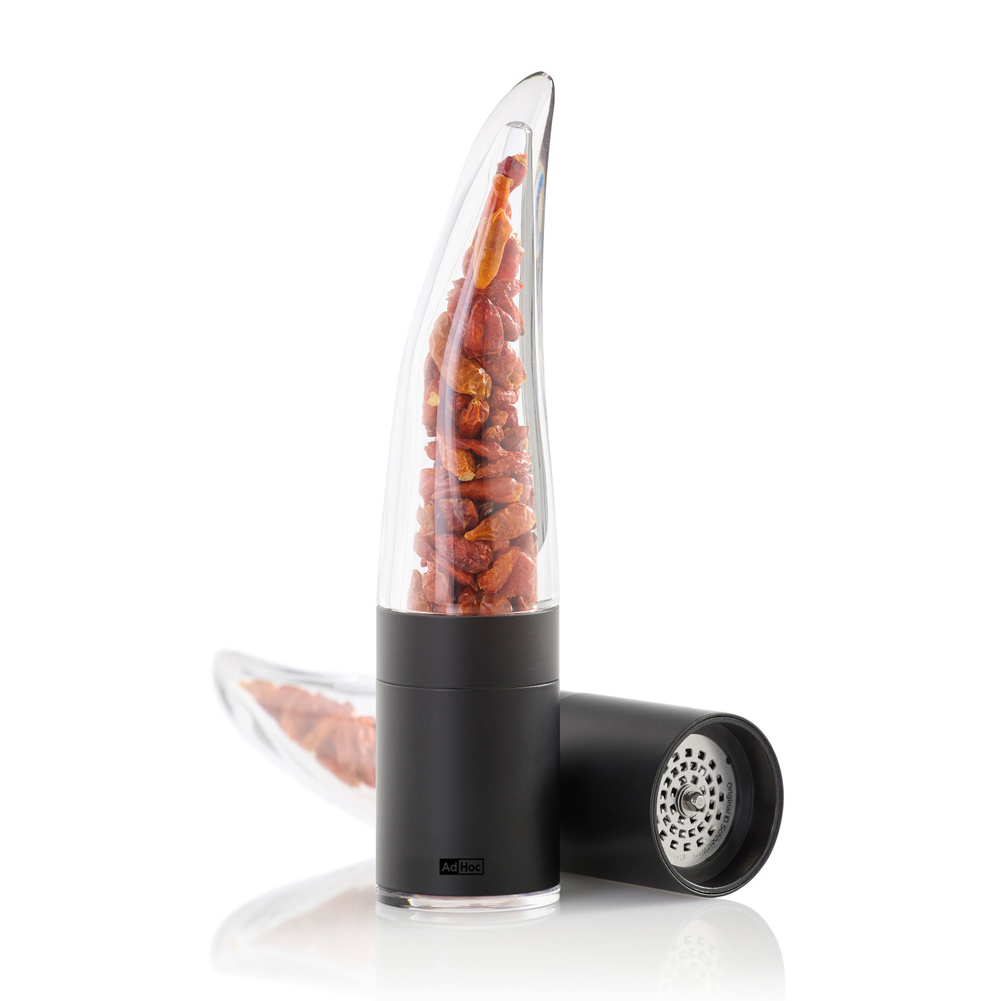 Młynek do papryczek chilli Pepe czarny z opatentowanym mechanizme cięcia PreciseCut®. Młynek PEPE potnie nie tylko suche papryczki i ich nasiona, ale również płatki imbiru, nasiona kopru, kminku, kolendry, gorczycy oraz wiele innych. Cięcie pozwala lepiej rozwinąć aromat ziół. Przeźroczysta pokrywka na spodzie nie tylko zbiera okruchy przypraw, ale ogranicza wietrzenie. Produkt został zaprojektowany przez Gabriele Kaltenbach. Aby napełnić młynek należy odkręcić przeźroczystą górną część a następnie napełnić zbiorniczek. Nigdy nie ubijaj przypraw, aby wsypać więcej. Pozostaw przestrzeń, aby móc swobodnie go zamknąć. Zwracaj uwagę na jakość przypraw, szczególnie czy nie są zanieczyszczone. Nie należy myć w zmywarce. Czyścimy lekko wilgotną, miękka ściereczką. Nigdy nie należy młynka zanurzać w wodzie. Materiał: stal nierdzewna, akryl. Przybliżone wymiary: wysokość - 20,5cm, średnica - 4,5 cm. Przybliżone wymiary brutto: wysokość - 21cm, długość - 6cm, szerokość - 5cm. Przybliżona waga brutto: 0,212kg. Opakowanie: kartonowe pudełko prezentowe.Bezpieczeństwo - rodzaj ostrzeżenia