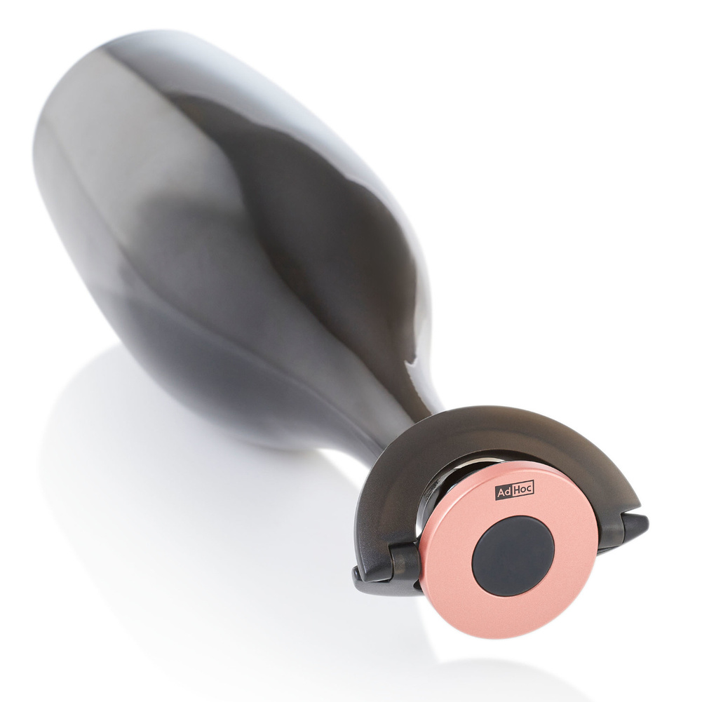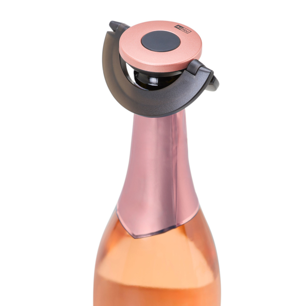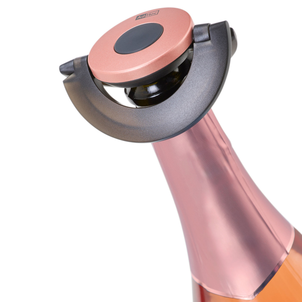 Korek do szampana Gusto czarno-różowy wyjątkowo niski i płaski, idealnie sprawdza się, kiedy trzeba przechować otwartą butelkę szampana w lodówce! Silikonową uszczelkę blokujesz na szyjce butelki za pomocą ruchomych półokręgów - uch, całkowicie ją uszczelniając. Idealny do przechowywania butelki w drzwiach lodówki. Sprawdzi się do butelek szampana, wina musującego i crémant. Produkt został zaprojektowany przez AdHoc Design Team. Materiał: plastik oraz silikon. Przybliżone wymiary: wysokość - 1,7cm, średnica - 8,2cm. Przybliżone wymiary brutto: wysokość - 8,2cm, długość - 8,2cm, szerokość - 2cm. Przybliżona waga brutto: 0,056kg. Opakowanie: kartonowe pudełko prezentowe.Bezpieczeństwo - rodzaj ostrzeżenia