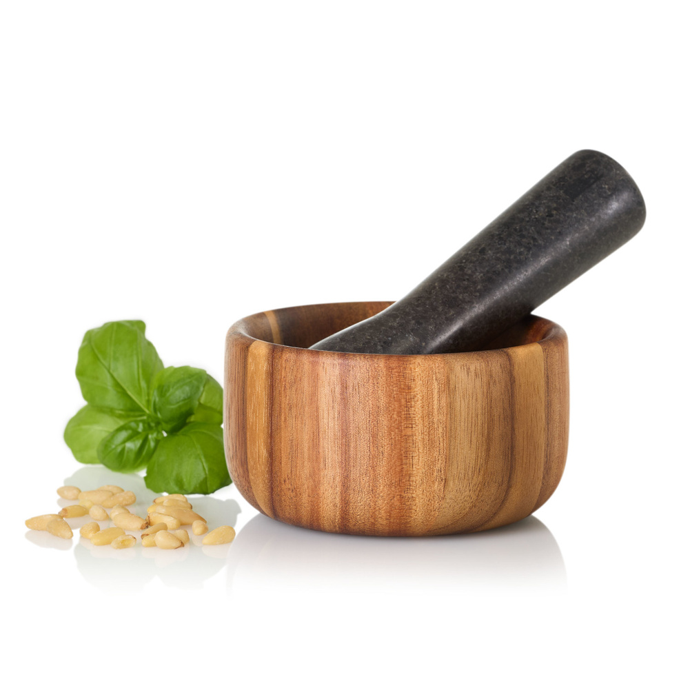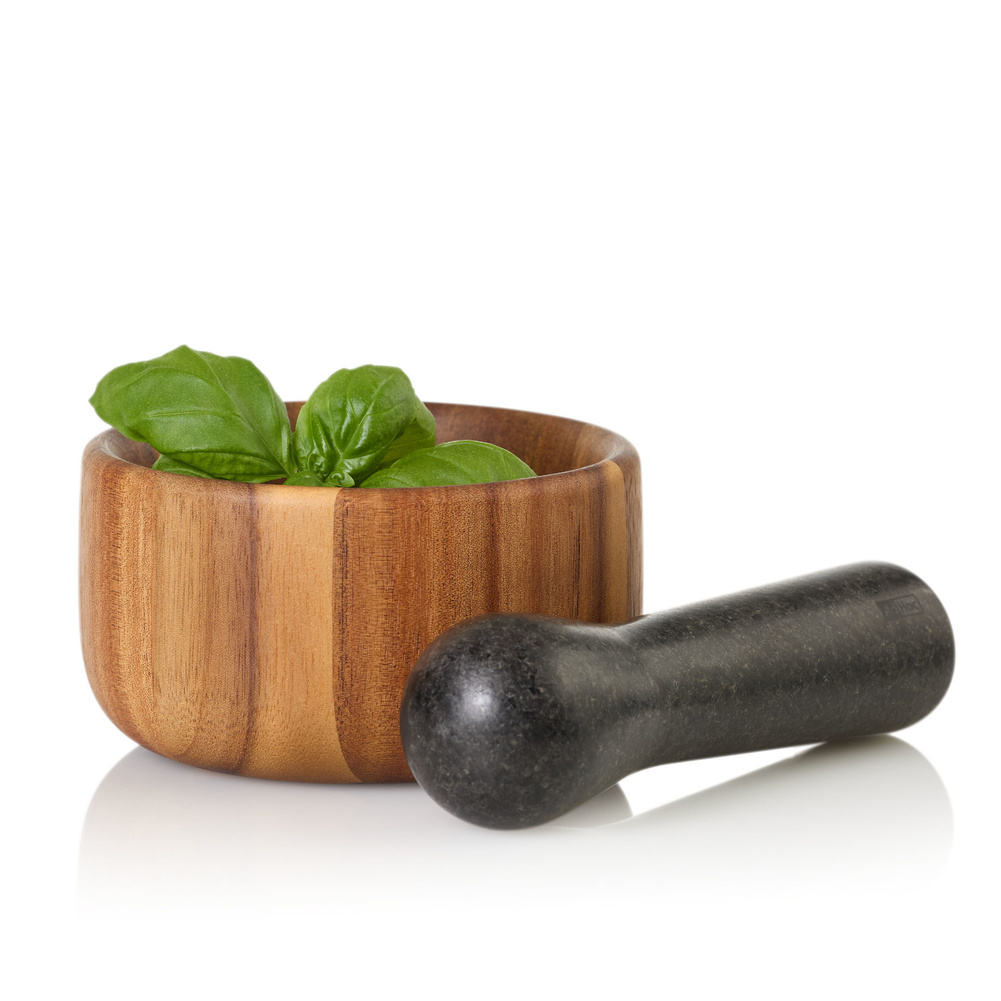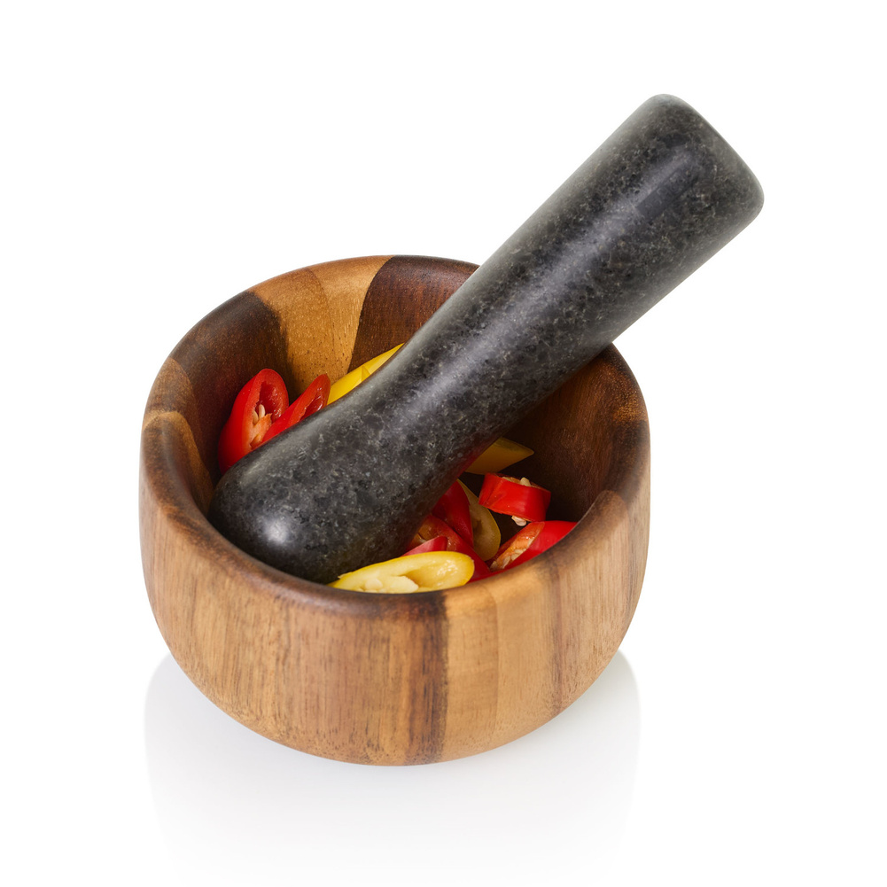 Moździerz Taru o pojemności 190ml, która rozbudzi kuchenną kreatywność. Wykonany z naturalnych materiałów ułatwi miażdżenie i ścieranie zarówno wysuszonych jak i świeżych ziół oraz przypraw, uwalniając pełnię smaków. Kształt tłuczka oraz misy są idealnie dopasowane, aby umożliwić wszechstronne użytkowanie. Miska została wykonana z antybakteryjnego drewna akacjowego, natomiast tłuczek z neutralnego smakowo granitu. Produkt został zaprojektowany przez Rolanda Kreitera. Zaleca się czyścić ręcznie! Materiał: miska drewno akacjowe, granit. Przybliżone wymiary miski: średnica - 11,5cm, wysokość - 6cm. Przybliżone wymiary tłuczka: średnica - 4cm, wysokość - 14cm. Przybliżone wymiary brutto: wysokość - 11,2cm, długość - 11,6cm, szerokość - 12,7cm. Przybliżona waga brutto: 0,596kg. Opakowanie: kartonowe pudełko prezentowe.