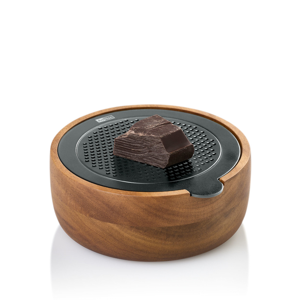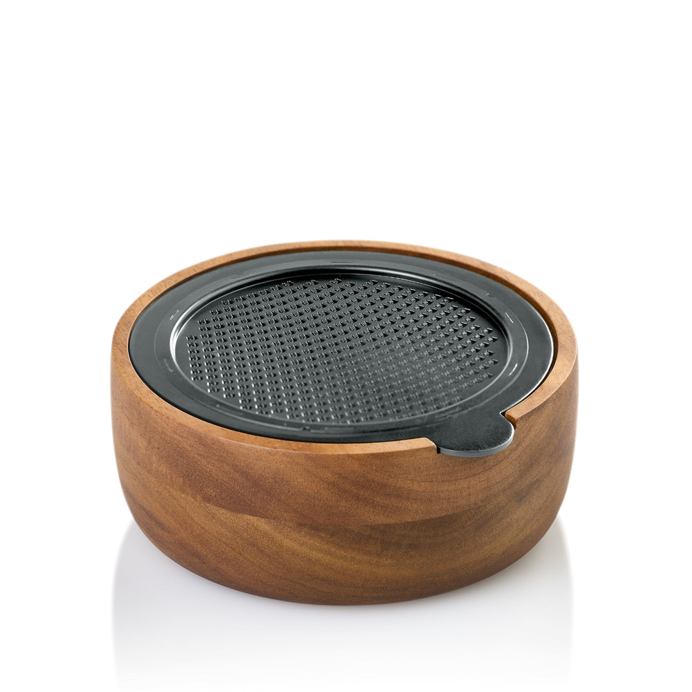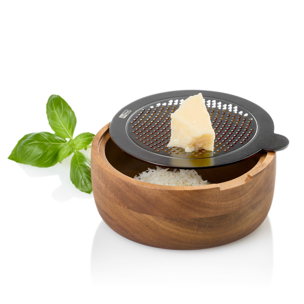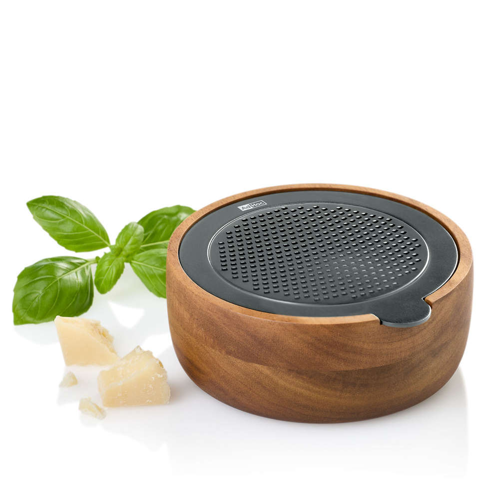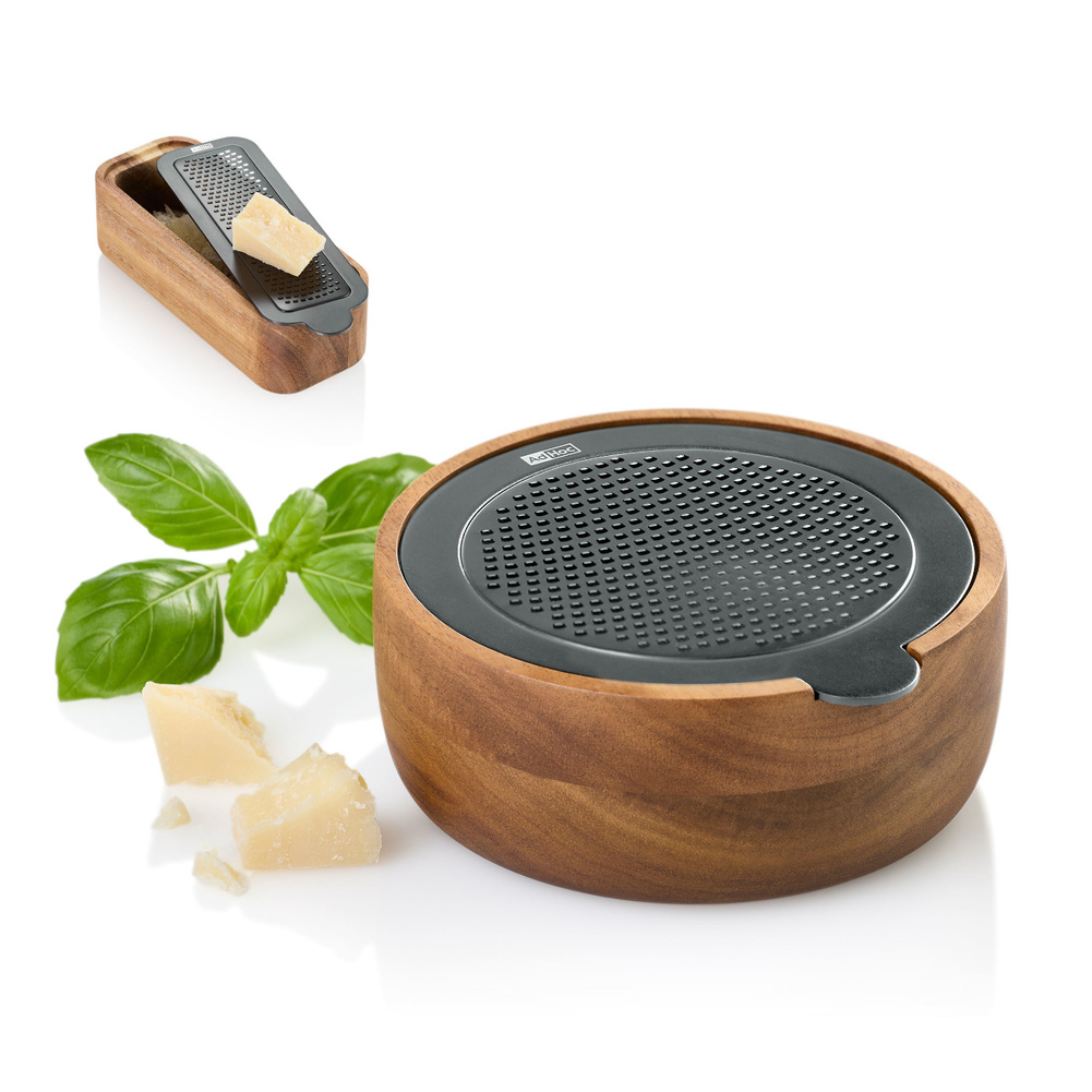 Fototrawione, zakrzywione ostrze PreciseGrate in curvedDesign posiada dużą powierzchnię tarcia, sprawiając że praca z tarką CutnServe jest komfortowa i łatwa. Przyda się do twardych serów, przypraw, orzechów, czekolady i wielu innych produktów. Akacjowa miska może posłużyć do serwowania startego produktu, a umieszczone na jej spodzie antypoślizgowe stopki zapewniają stabilność podczas tarcia. Ostrze można z łatwością zdjąć z deski i włożyć do mycia do zmywarki i odłożyć odwrotną stroną na misce do bezpiecznego przechowywania. Produkt został zaprojektowany przez Roberta Franzhelda. Materiał: Stal nierdzewna, drewno akacjowe. Przybliżone wymiary: głębokość pojemnika mierzona wewnątrz - 4cm, średnica góra - 13cm, średnica wewnętrzna pojemnika - 10,5cm, średnica powierzchni trącej - 9cm. Przybliżone wymiary brutto: wysokość - 13cm, długość - 13,2cm, szerokość - 6cm. Przybliżona waga brutto: 0,250kg. Opakowanie: kartonowe pudełko prezentowe.Bezpieczeństwo - rodzaj ostrzeżenia