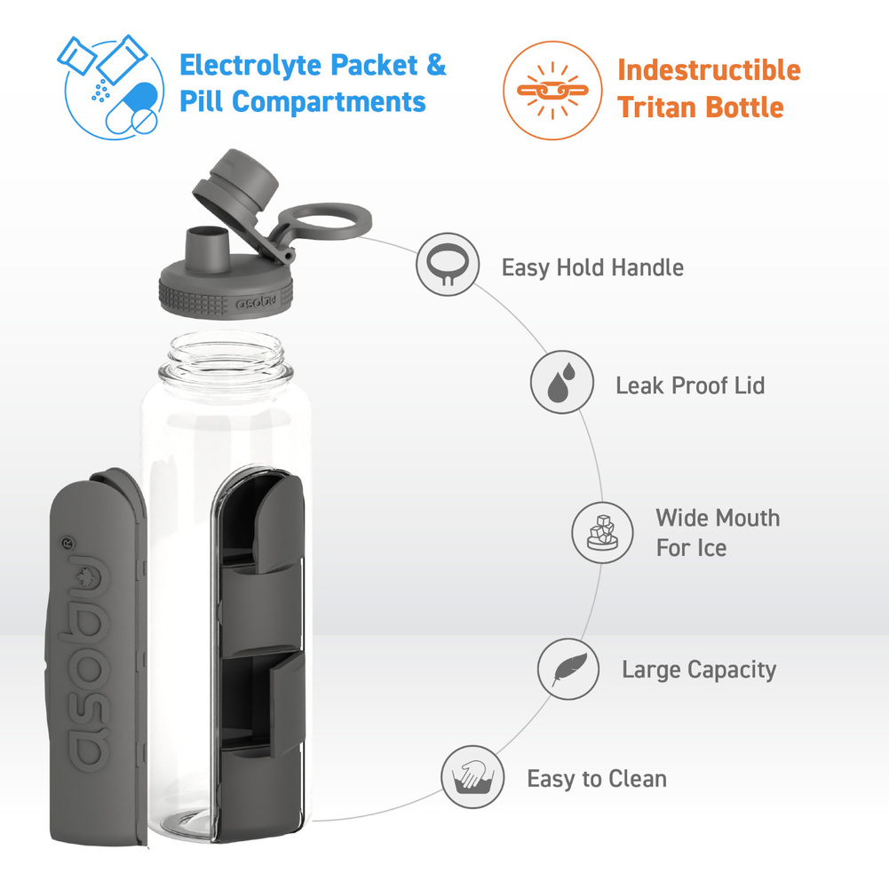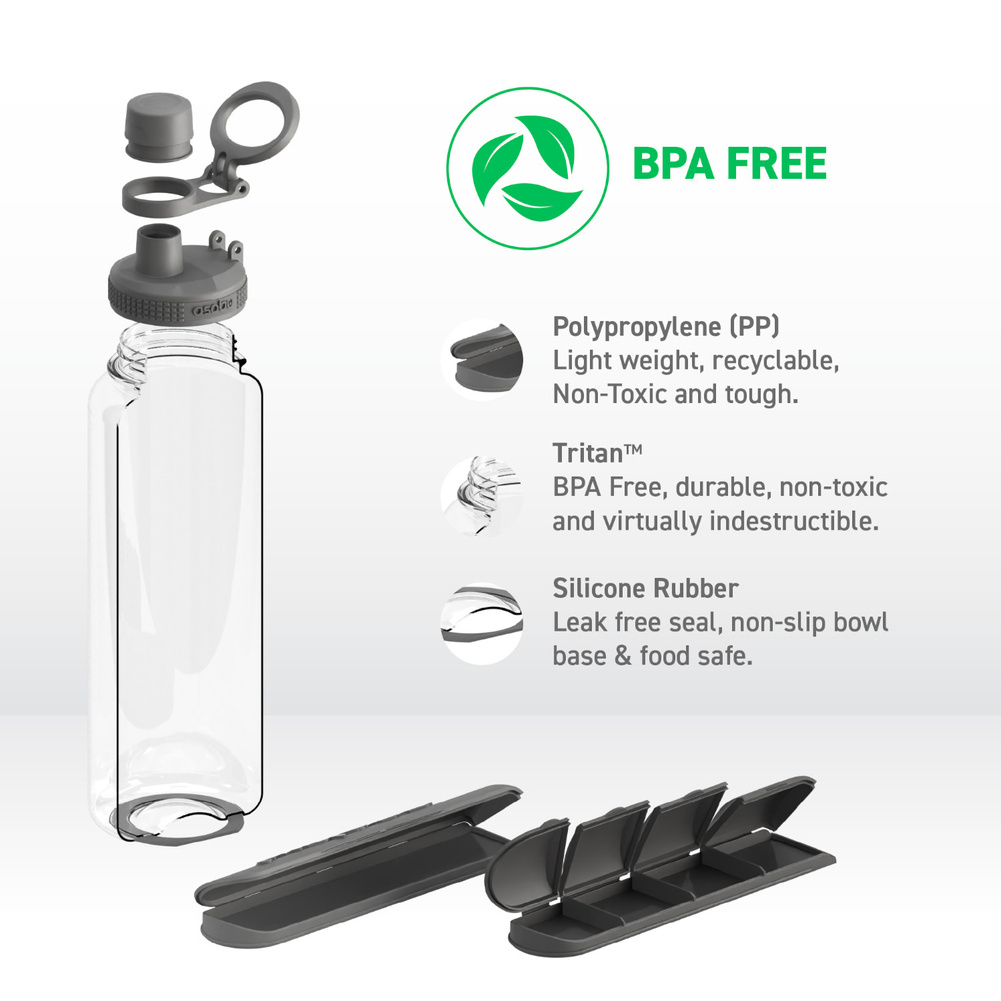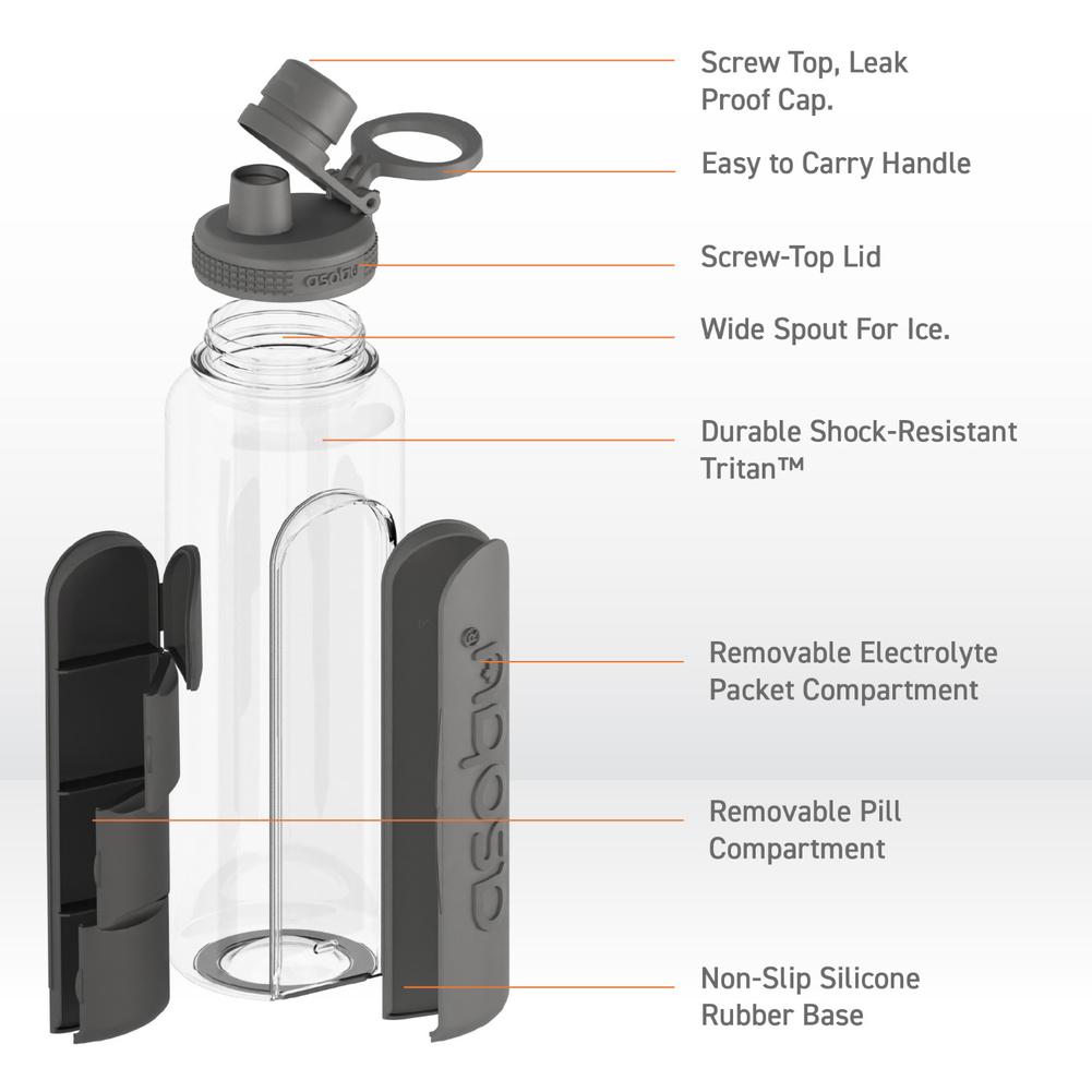 Elektrolity pomagają regulować funkcjonowanie nerwów, poprawiają nawodnienie organizmu i uzupełniają płyny utracone wraz z potem. Butelka ASOBU Electrolyte ma specjalne pojemniki do przechowywania saszetek/tabletek z elektrolitami w proszku lub suplementów, które z łatwością możesz zamontować na butelce. Pojemnik można zamontować na boku butelki lub wrzucić w torbę, gdy idziemy na siłownię lub w teren. Teraz w każdej chwili możesz je uzupełnić. Butelka o pojemności 1,2 litra jest wykonana z wytrzymałego tritanu, ma duży uchwyt ułatwiający przenoszenie i zabezpieczenie przed wyciekaniem. Umieszczony na spodzie silikonowy pierścień zapobiega przypadkowemu ześliźnięciu się butelki. Z boku butelki czytelna podziałka w uncjach i mililitrach ułatwia dozowanie. W trosce o środowisko i zdrowie produkty ASOBU wykonane są z trwałych i bezpiecznych materiałów jak stal nierdzewna 18/8, tritan i tworzywa BPA FREE. Tworzywo BPA Free oznacza, że jest bezpieczne i wolne od szkodliwych substancji. Zalecenia: - Przed pierwszym użyciem umyj wszystkie elementy naczynia ręcznie. Uwaga: 1. Produkt nie jest odpowiedni dla dzieci. 2. Nie należy zamrażać lub podgrzewać butelki na płytach kuchennych, w piekarniku lub kuchence mikrofalowej, butelka służy do napełniania płynem i nie jest odpowiednim naczyniem do podgrzewania lub zamrażania. 3. Nie należy wlewać napojów gazowanych, produktów mlecznych i żywności dla dzieci ze względu na ryzyko rozwoju bakterii. 4. Butelka nie służy do przechowywania wody, czy innych płynów dłużej niż 24 godziny. 5. Wszystkie elementy butelek należy myć ręcznie, gąbką i płynem do naczyń. Umyte naczynie należy dokładnie osuszyć i pozostawić do doschnięcia w suchym dobrze wentylowanym miejscu. 6. Nie należy stosować agresywnych środków czyszczących takich jak chlor, wybielacz czy też soda. Materiał: tritan, tworzywo BPA FREE, silikon. Przybliżone wymiary: wysokość - 30cm, średnica - 9cm, pojemność: 1,3l. Przybliżone wymiary brutto: wysokość - 30,5cm, długość - 11,5cm, szerokość - 9,8cm. Przybliżona waga brutto: 0,378kg. Opakowanie: kartonowe pudełko prezentowe.Bezpieczeństwo - rodzaj ostrzeżenia