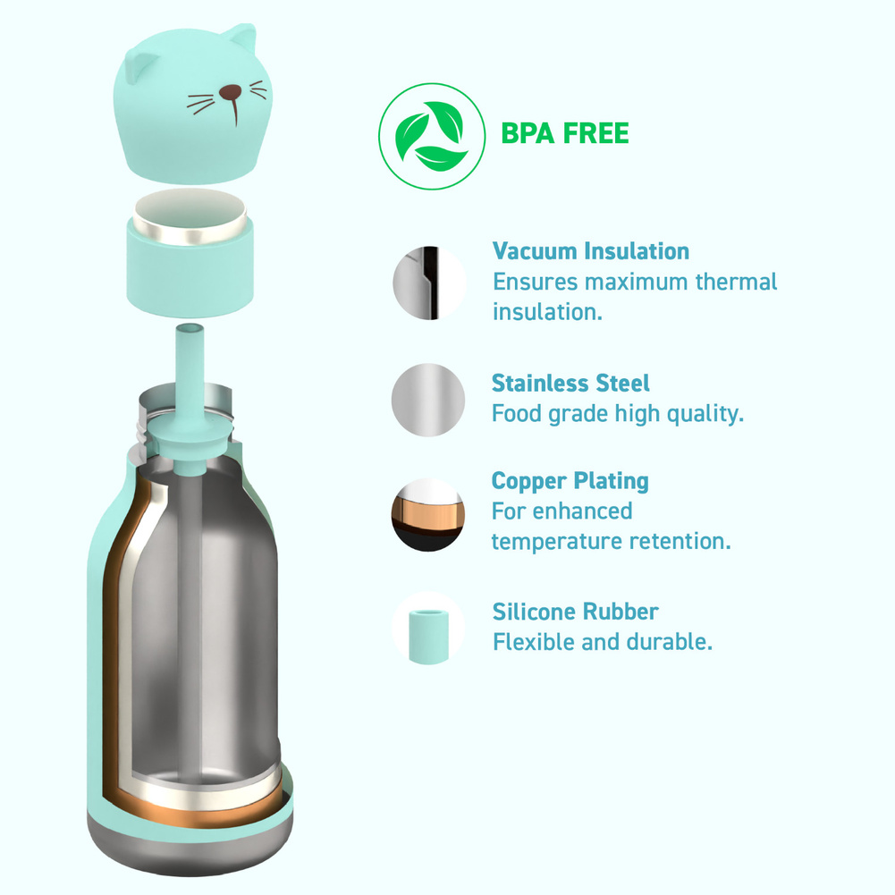 Szukasz zabawnej i funkcjonalnej butelki na wodę dla swojego malucha? Butelka Asobu z linii Bestie to urocza butelka na wodę dla dzieci ze stali nierdzewnej z różnymi główkami na zakrętce! Butelkę pokrywa na zewnątrz tworzywo typu SOFT TOUCH, co sprawia, że butelka jest przyjemna w dotyku. Wewnątrz butelki znajduje się wyjmowana słomka z miękkim ustnikiem. Na spodzie butelki koło z antypoślizgowego silikonu. Butelka przeznaczona jest dla dzieci od 4 roku życia. W trosce o środowisko i zdrowie produkty ASOBU wykonane są z trwałych i bezpiecznych materiałów jak stal nierdzewna, tritan i tworzywa BPA FREE. Tworzywo BPA Free oznacza, że jest bezpieczne i wolne od szkodliwych substancji. Dwuścienna konstrukcja butelek/termosów nie tylko dłużej utrzymuje temperaturę, ale też zapobiega kondensacji. Dwuścienne ścianki wewnątrz są pokryte dodatkowo miedzią dla jeszcze lepszej izolacji. Zalecenia: - Przed pierwszym użyciem umyj wszystkie elementy naczynia ręcznie. - Przed napełnieniem, zimnym lub gorącym płynem zaleca się butelkę przepłukać odpowiednio zimną lub gorącą wodą. - Pij ostrożnie z butelki szczególnie jeśli została napełniona gorącym płynem! Uwaga: 1. Nie należy zamrażać lub podgrzewać butelki/termosu na płytach kuchennych, w piekarniku lub kuchence mikrofalowej, butelka służy do napełniania płynem i nie jest odpowiednim naczyniem do podgrzewania lub zamrażania. 2. Nie należy wlewać napojów gazowanych, produktów mlecznych i żywności dla dzieci ze względu na ryzyko rozwoju bakterii. 3. Nie należy umieszczać kostek lodu wewnątrz. 4. Butelka nie służy do przechowywania wody, czy innych płynów dłużej niż 24 godziny. 5. Wszystkie elementy butelek/termosów należy myć ręcznie, gąbką i płynem do naczyń. Umyte naczynie należy dokładnie osuszyć i pozostawić do doschnięcia w suchym dobrze wentylowanym miejscu. 6. Nie należy stosować agresywnych środków czyszczących takich jak chlor, wybielacz czy też soda. Materiał: stal nierdzewna, tworzywo BPA FREE, silikon, miedź. Przybliżone wymiary: wysokość - 20,5cm, średnica - 7,5cm, pojemność: 460ml. Przybliżone wymiary brutto: wysokość - 22cm, długość - 8,4cm, szerokość - 8,2cm. Przybliżona waga brutto: 0,388kg. Opakowanie: kartonowe pudełko prezentowe.Bezpieczeństwo - rodzaj ostrzeżenia