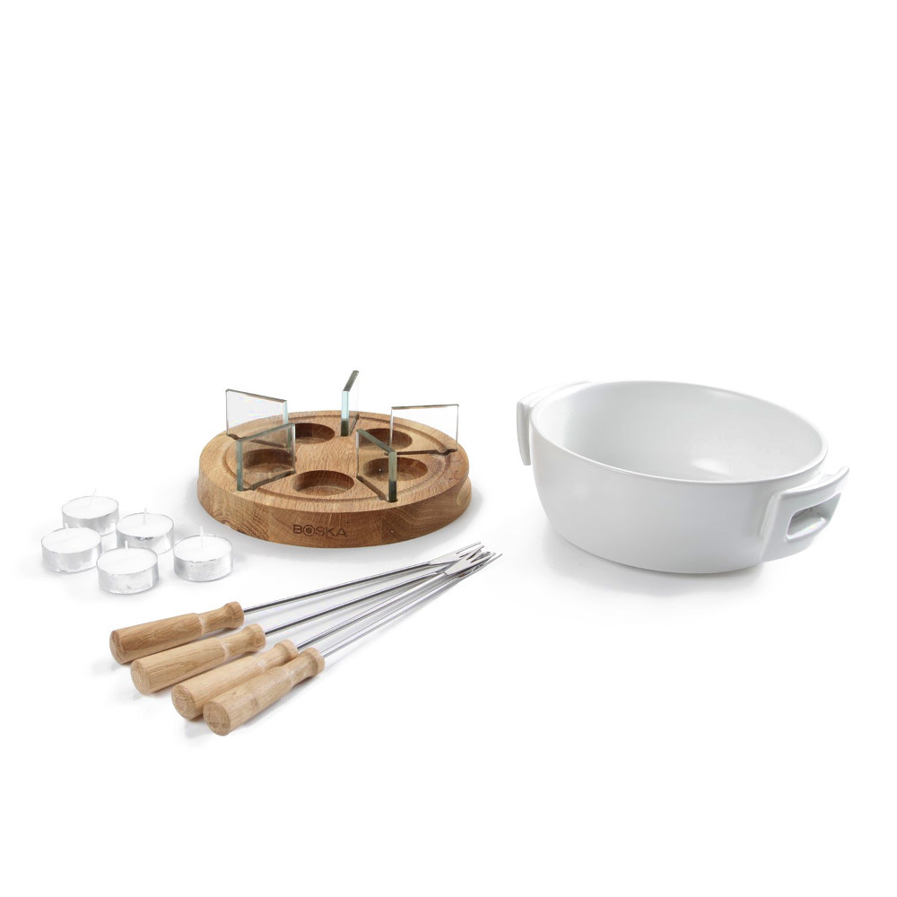 W skład zestawu wchodzi: ceramiczna misa, podstawa drewniana z wydrążonymi miejscem na podgrzewacze i ze szklanymi podpórkami pod misę, 4 widelczyki ze stali nierdzewnej z drewnianą rękojeścią, 5 podgrzewaczy.