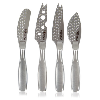 Zestaw Noży Mini Monaco+ to wyjątkowo, elegancki zestaw do sera od parmezanu do sera zupełnie mazistego do smarowania! W skład zestawu wchodzi: nóż do serów twardych, o krótkiej, ostrej klindze, nóż do serów miękkich o rozwidlonym czubku, nóż chessy o klindze przypominającej ser z dziurami i czwarty nóż zaokrąglony do smarowania. Noże są wykonane w całości ze stali nierdzewnej, specjalny wzór na klindze, przypominającym pikowanie, sprawia, że ser nie przylega w trakcie krojenia. Zestaw zapakowany jest w elegancki kartonik i może być wyjątkowym upominkiem dla smakosza sera, który z pewnością doceni nie tylko jego walory użytkowe, ale również oryginalny design! Noże należy myć ręcznie.