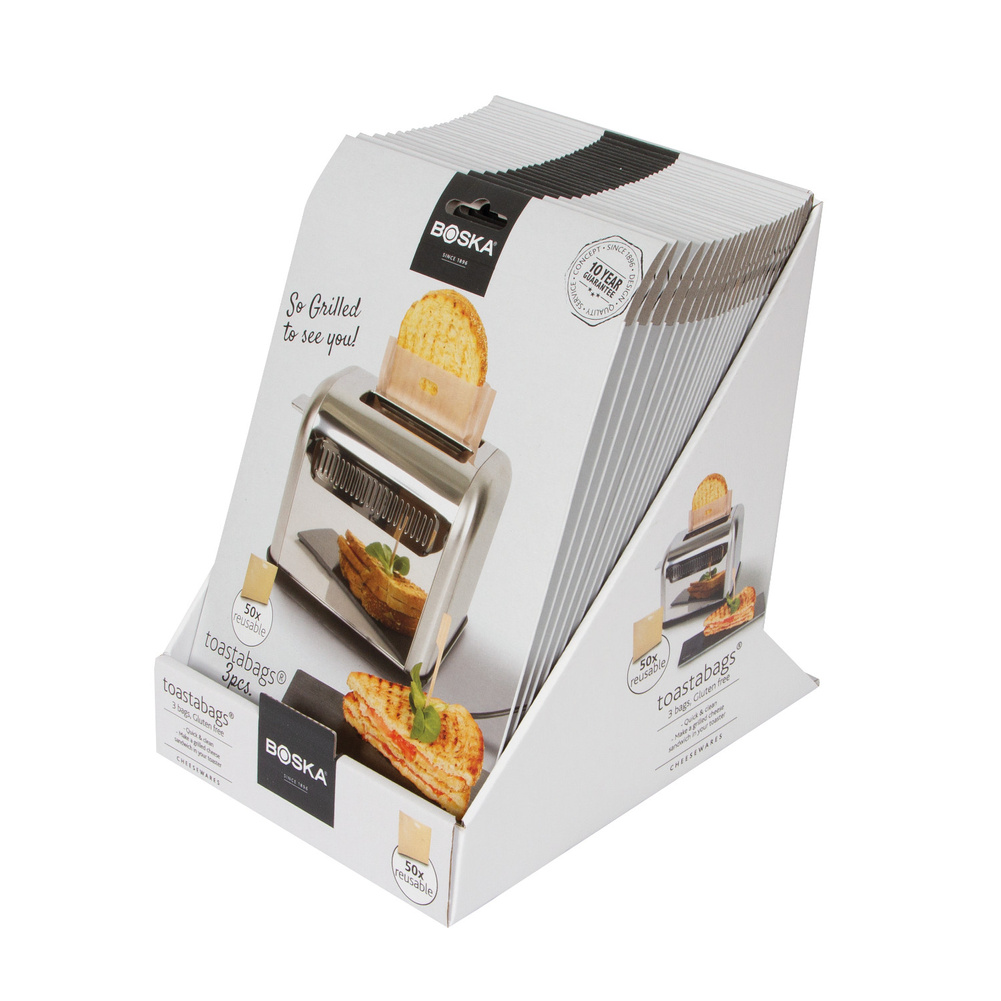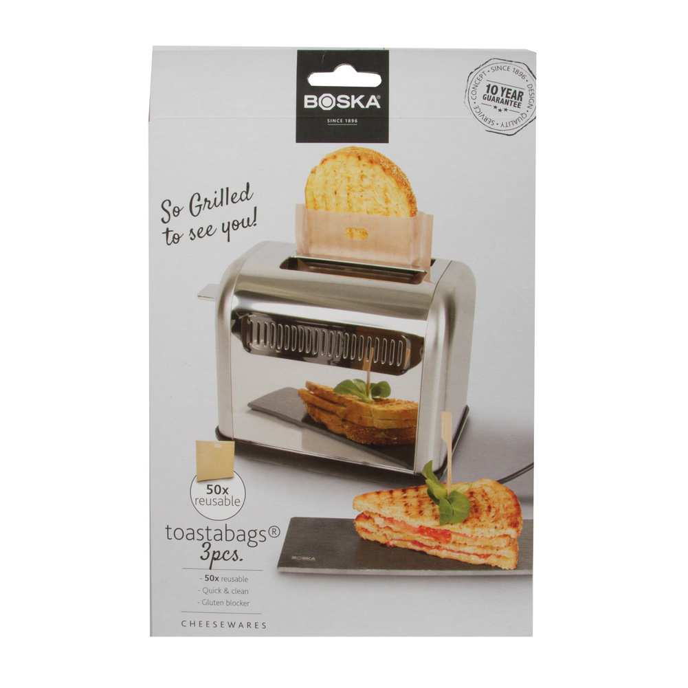 Chcesz zrobić szybko i bez bałaganu gorącego , chrupiącego tosta z serem? Z Toastabags to się uda! Pyszna, złocistobrązowa kanapka z serem bez okruchów i resztek spalonego sera w tosterze ... nieprawdopodobne a jednak możliwe. Przepis jest prosty weź dwie kromki pieczywa i włóż pyszny ser pomiędzy, tak przygotowaną kanapkę zapakuj do torebki i na 3 minuty do tostera. Możesz również podgrzać kawałek pizzy lub chleb pita za pomocą Toastabags. Torebka na tosty jest idealna dla alergików, kanapka nie styka się z urządzeniem więc nie zostanie zanieczyszczona resztkami pozostałymi w tosterze. Torebka wykonana jest z włókna szklanego z powłoką PTFE. Jest łatwa w czyszczeniu, możesz umyć ją ręcznie lub w zmywarce na górnej półce. W zestawie są 3 torebki do wielokrotnego użycia – ok. 50 razy każda. Oznacza to, że jeden zestaw wystarczy na 150 grillowanych tostów z serem! Przybliżone wymiary: długość - 16,5cm, szerokość - 16cm. Przybliżone wymiary brutto: wysokość - 27cm, długość - 17,4cm, szerokość - 0,1cm. Przybliżona waga brutto: 0,035kg. Opakowanie: tekturowa torebka zawieszka.