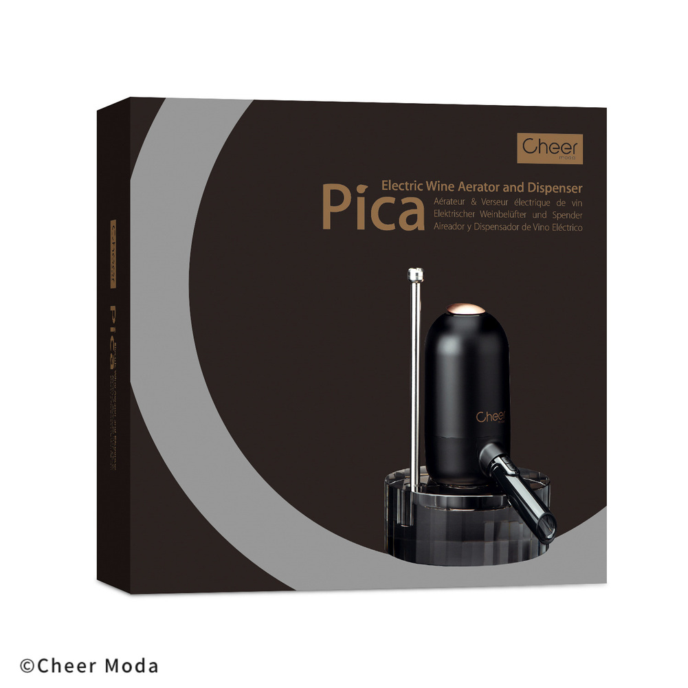 Pica to automatyczny napowietrzacz i nalewak o atrakcyjnej i eleganckiej sylwetce. Za naciśnięciem przycisku nalewa wino do kieliszka a po przesunięciu suwaka na nalewaku natychmiastowo napowietrza wino w takim stopniu jak 15-20 minut przebywania wina w dekanterze. W zestawie znajduje się również kryształowa podstawa do aeratora. Urządzenie jest zasilane 4 bateriami AAA, które należy oddzielnie dokupić. Materiał: ABS, stal nierdzewna, żel krzemionkowy, kryształ. Wymiary: wysokość – 12,6cm, długość – 10,5cm, szerokość – 5,18cm. Opakowanie: kartonowe pudełko prezentowe.Bezpieczeństwo - rodzaj ostrzeżenia
