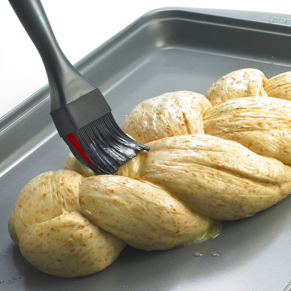 Pędzelek silikonowy z 2 rodzajami silikonowych frędzli o różnym stopniu sztywności: zewnętrzne, czerwone frędzle są bardzo delikatne i wiotkie, znajdujące się wewnątrz czarne - sztywne. Miękkie i sztywne silikonowe frędzle pomagają nabrać i rozprowadzić sos, masło, olej. Silikon nie przyjmuje zapachów i jest łatwy do utrzymania w czystości. Pędzelek można myć w zmywarce. Pędzelek jest odporny na temperaturę do 240C Przybliżone wymiary: długość całkowita 20cm, długość frędzli 4cm, szerokość 4cm x 2cm Przybliżone wymiary brutto: wysokość 23cm, długość 8,8cm, szerokość 2cm Przybliżona waga brutto: 0,072kg Opakowanie: tekturowa zawieszka, torebka foliowa