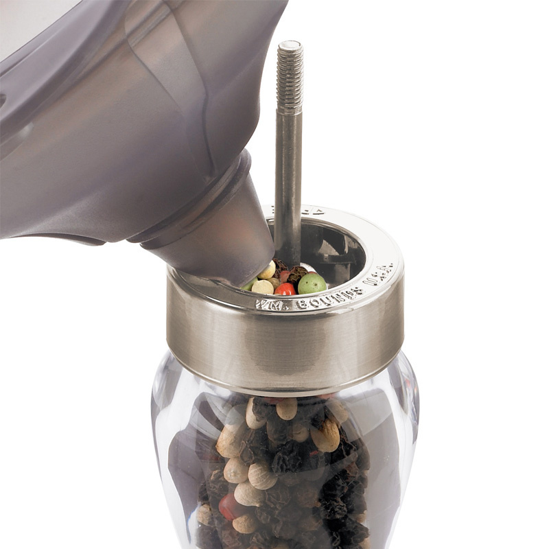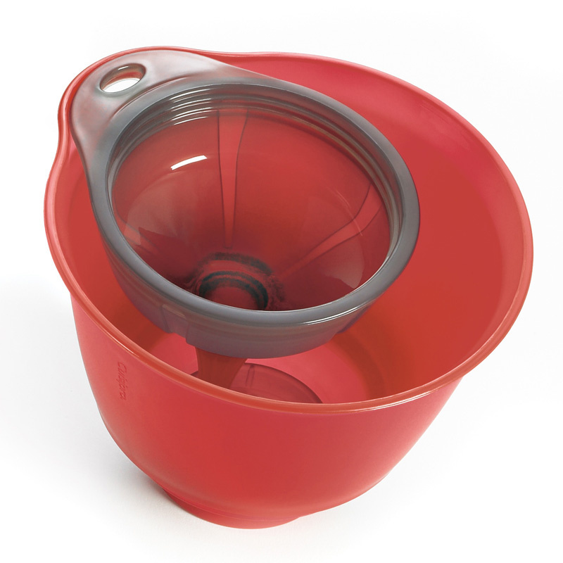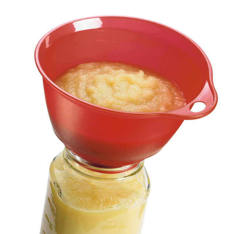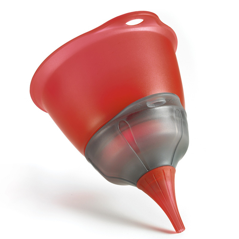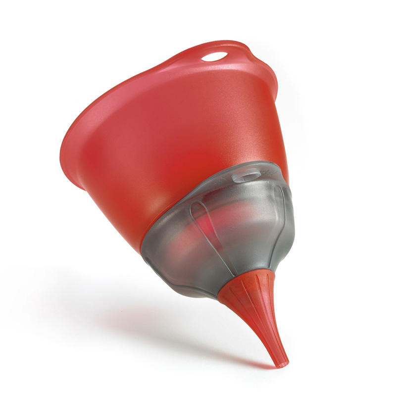Nowy zestaw lejków 3 w 1 dzieli się na trzy wyspecjalizowane części, które pomogą Ci w kuchni poradzić sobie z nalewaniem, przelewaniem przez różne rozmiary otworu. • Mały lejek służy do wsypywania przypraw do buteleczek. • Średni lejek, z unikatowym dzióbkiem do napełniania młynków . • Duży lejek do z wyjmowanym filtrem oraz szeroką końcówką do przelewania przetworów. • Lejki można łatwo złożyć do przechowywania, aby zajmowały niewiele miejsca. • Wykonany z plastiku odpornego na wysokie temperatury (219°F/104°C), aby można było wlewać zupy i kompoty. • Na obwodzie lejka znajdują się kanały powietrzne ułatwiające nalewanie. • Nie zawiera Bisfenolu A. • Można myć w zmywarce na najwyższej półce.
