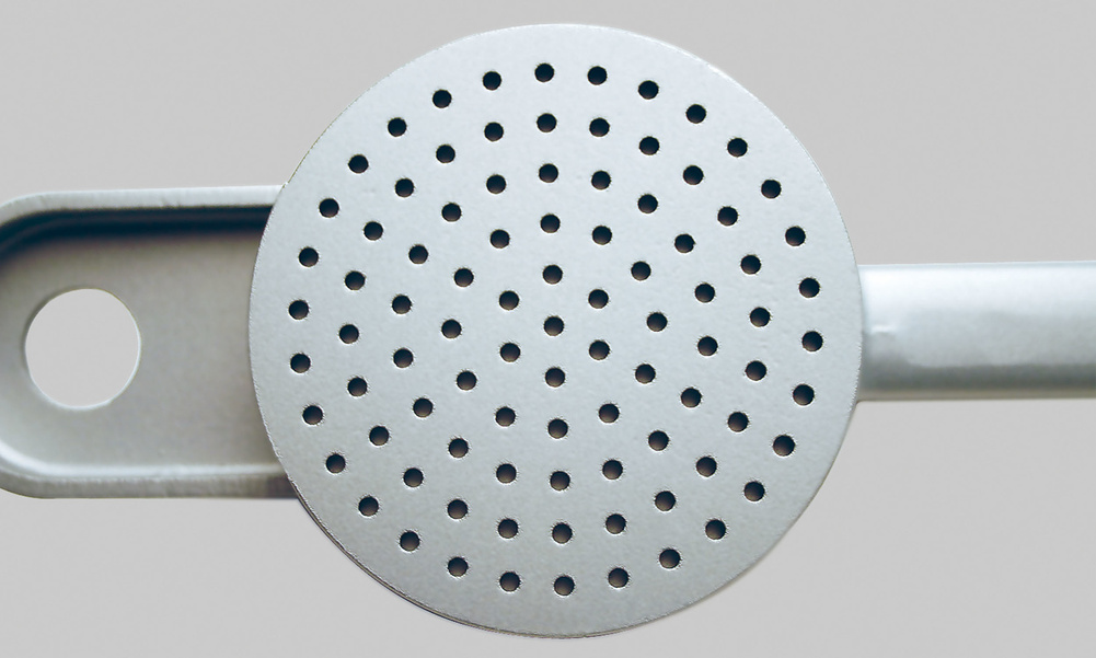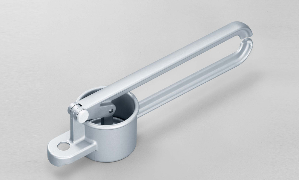 Solidna praska, wykonana z aluminium formowanego ciśnieniowo, pokryta srebrną powłoką. Długie ramię o długości 30cm, licząc od środka praski, pozwala na lekkie i łatwe przeciskanie. Na przeciwległym końcu znajduje się podpora z otworem umożliwiająca oparcie narzędzia na garnku w trakcie pracy, jak i jego zawieszenie na haczyku, gdy nie jest już używane. Zalecane jest mycie ręczne. Produkt wykonany w Niemczech.