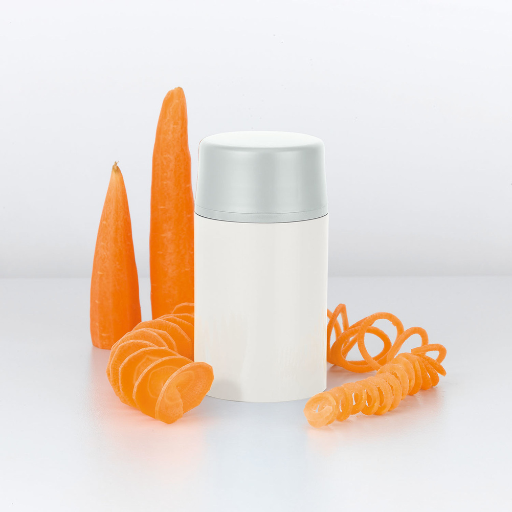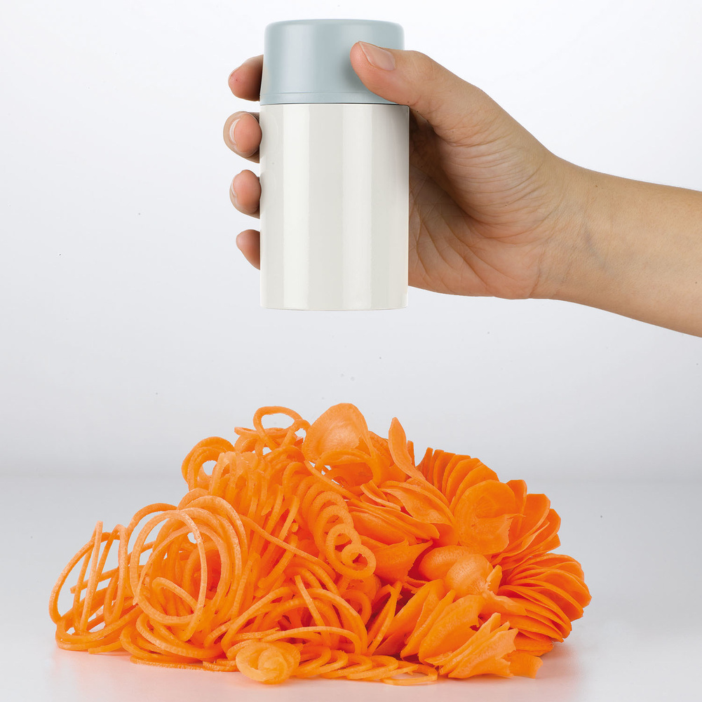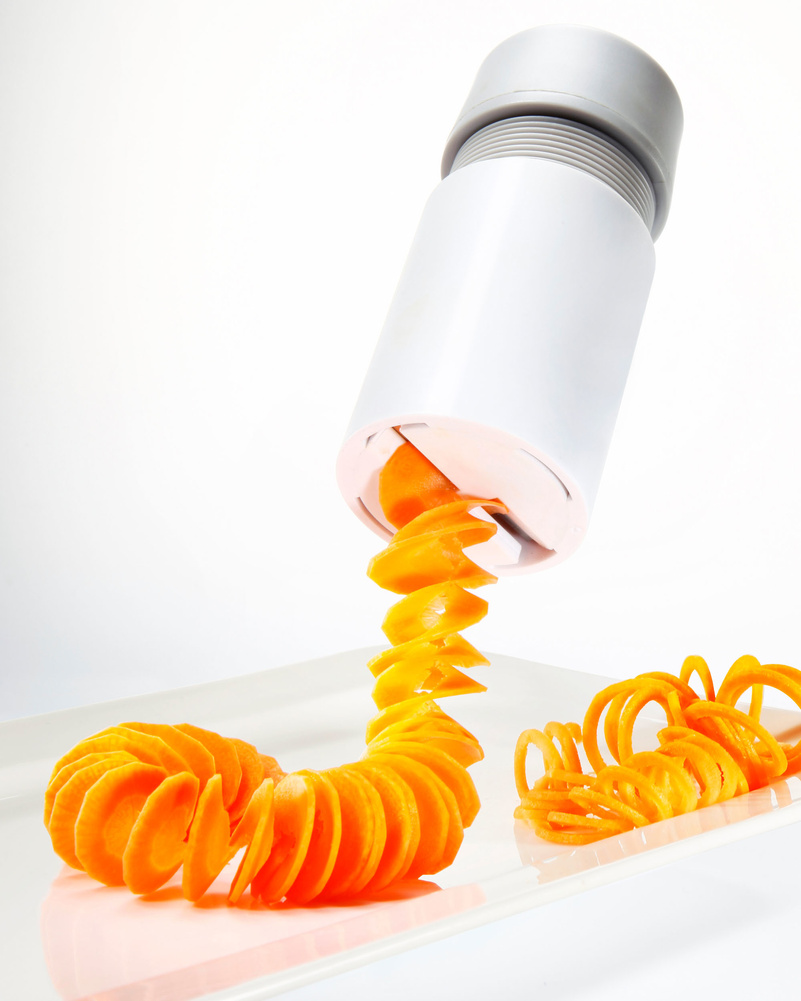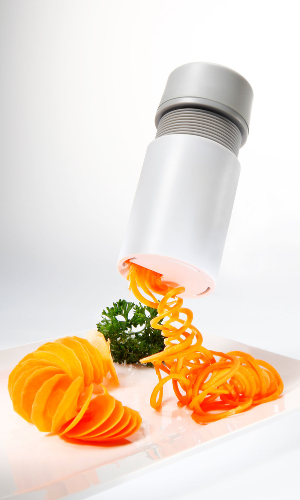 Krajalnica do tworzenia ozdobnych spiralek z warzyw i owoców. W zestawie znajdują się dwa pojemniki, każdy z innym rodzajem ostrzy przeznaczonych do nitek lub wstążek. Do tego zawarty został tłok dociskowy z gwintem i zębami itrzymującymi cięte warzywo. Produkt wykonany z materiału ABS, ostrza ze stali nierdzewnej. Zalecane jest mycie ręczne.Bezpieczeństwo - rodzaj ostrzeżenia