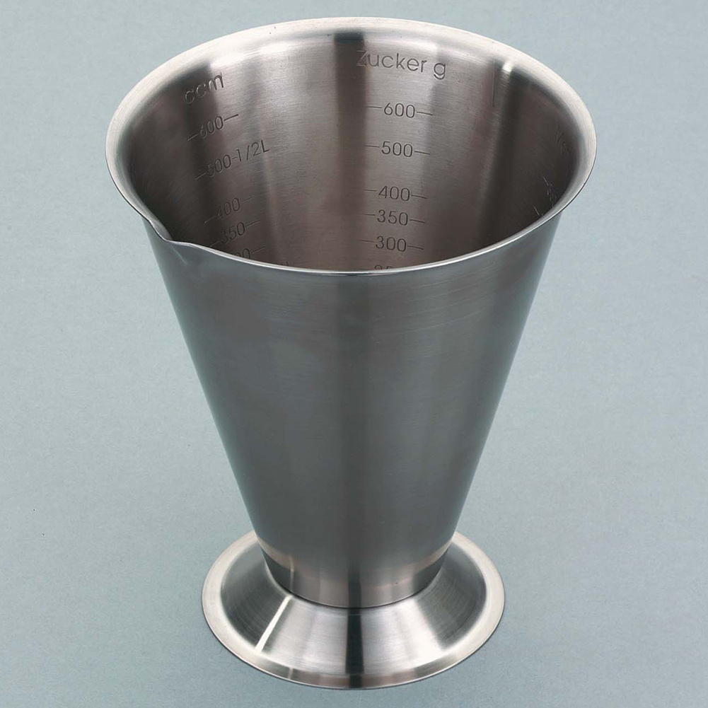 Miarka ze stali nierdzewnej o pojemności 750 mililitrów. Na wewnętrznej stronie zostały naniesione jednostki miary dla kakao, cukru, wody, maki, ryżu i rodzynek. Można myć w zmywarce.