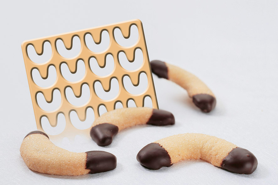 Forma do wykrawania waniliowych ciasteczek w kształcie półksiężyców na 28 sztuk. Forma do wycinania adwentowych, waniliowych półksiężyców jednych z najpopularniejszych ciasteczek w okresie Świąt Bożego Narodzenia u naszych zachodnich i południowych sąsiadów. W zestawie łopatka i dwa separatory dla łatwiejszego rozłożenia ciasta. Materiał: tworzywo sztuczne. Opakowanie: etykieta papierowa, folia stretch.Bezpieczeństwo - rodzaj ostrzeżenia