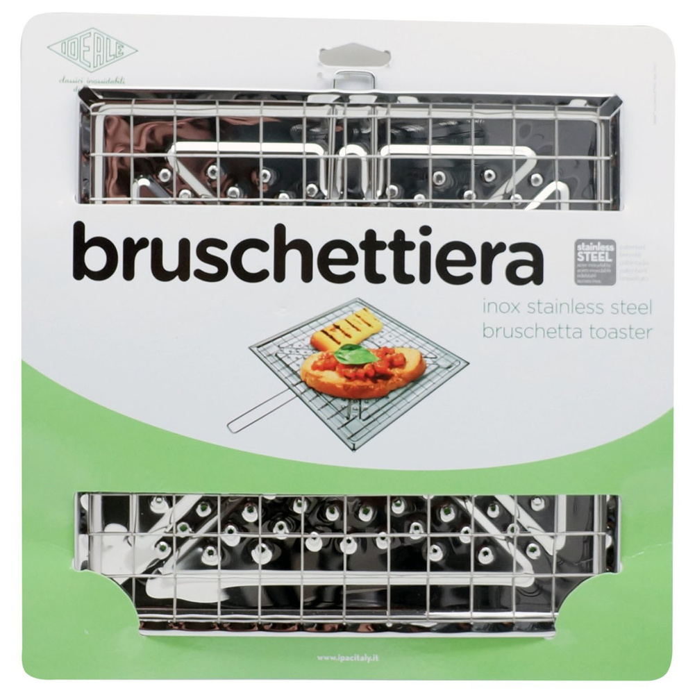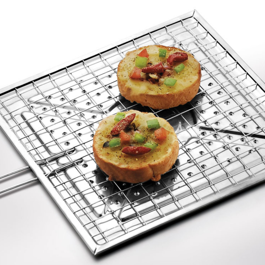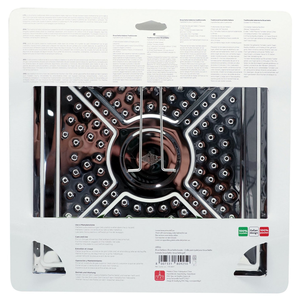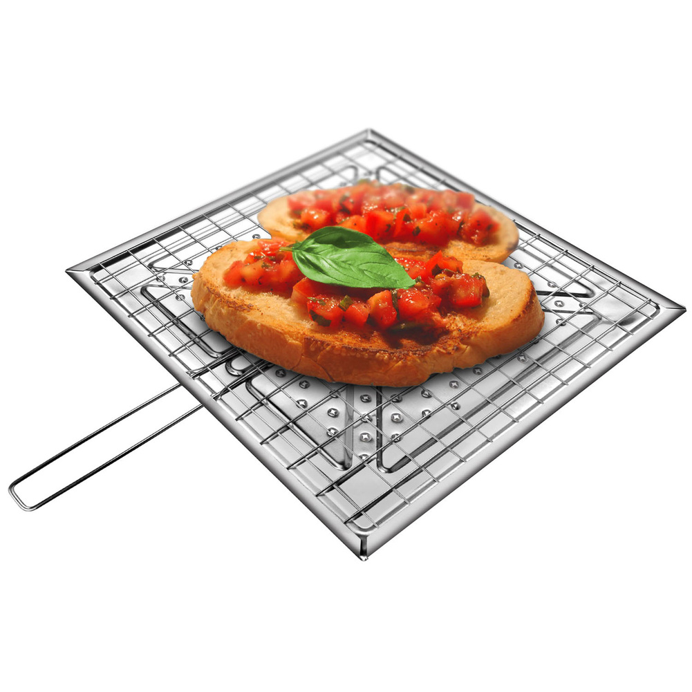 Toster do bruschetty ze stali nierdzewnej do tostowania chleba bezpośrednio na palniku. Jego przeznaczeniem jest przygotowywanie tostów z chleba na śniadanie, przystawki i do zup. Idealnie sprawdzi się w przygotowywaniu bruschetty, grillowaniu papryki, cukinii, bakłażanów, pieczarek i innych warzyw. Można myć w zmywarce. Produkt może nosić ślady produkcyjne, które w żaden sposób nie wpływają na jego walory użytkowe. Materiał: stal nierdzewna. Wymiary brutto: 30x30x1,5cm Wymiary netto: 25,3x24,7x0,8cm. Waga brutto: 0,308kg. Waga netto: 0,256kg.Bezpieczeństwo - rodzaj ostrzeżenia