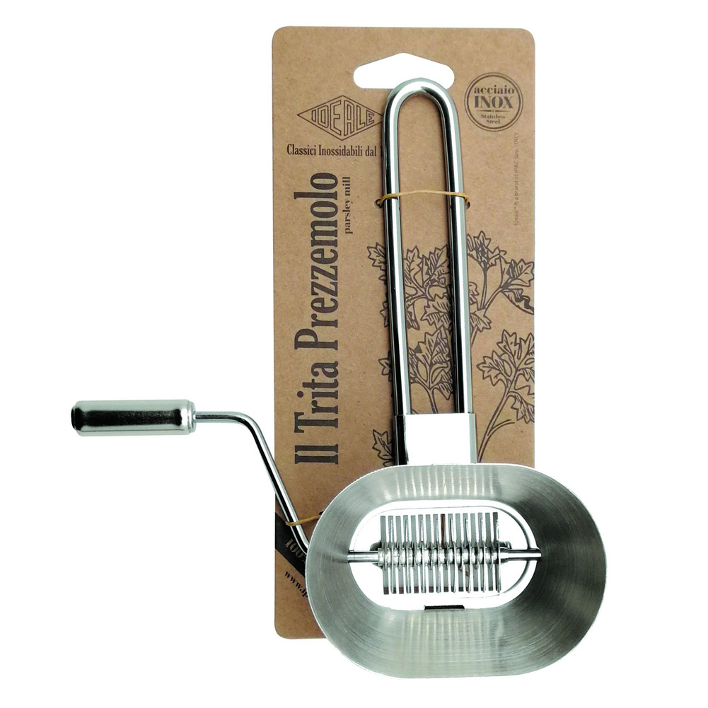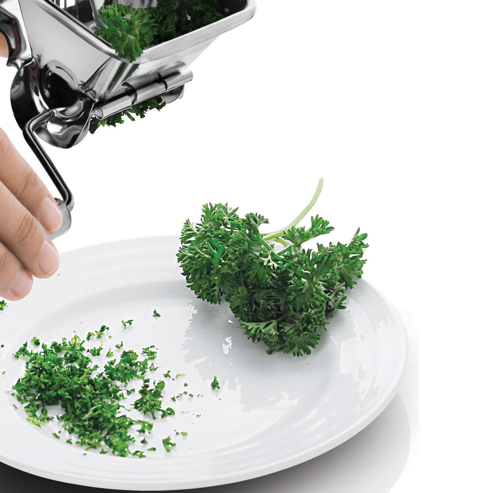 Młynek do pietruszki ze stali nierdzewnej stworzony do bezpiecznego cięcia pietruszki, rozmarynu, bazylii, szałwii i innych ziół bezpośrednio do Twoich potraw. Łatwy w czyszczeniu. Można myć w zmywarce. Produkt może nosić ślady produkcyjne, które w żaden sposób nie wpływają na jego walory użytkowe. Materiał: stal nierdzewna. Wymiary netto: 19,2x16x6,4cm. Wymiary brutto: 21x16x6,4cm. Waga brutto: 0,161kg. Waga netto: 0,154kg.Bezpieczeństwo - rodzaj ostrzeżenia