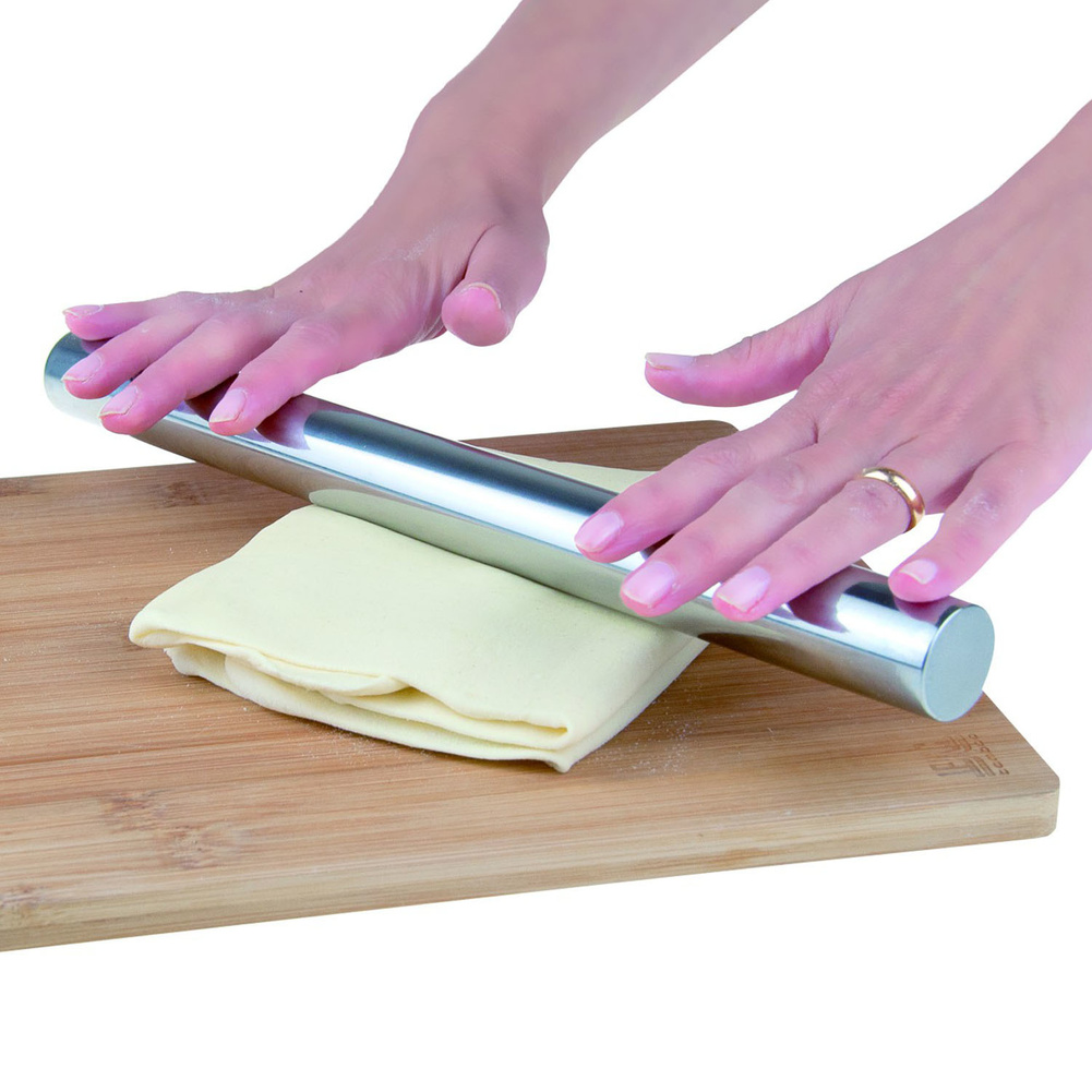 Profesjonalny wałek ze stali nierdzewnej do rozwałkowywania słodkiego lub słonego ciasta. Dzięki wykorzystaniu stali nierdzewnej można go stosować do wszystkich lepiących się ciast. Dla lepszego efektu można włożyć go do zamrażarki, co w połączeniu z zawartym w jego wnętrzu płynem sprawi, że idealnie sprawdzi się w wałkowaniu szczególnie tych ciast, które potrzebują niskich temperatur jak ciasto francuskie i inne kruche ciasta. Można myć w zmywarce. Materiał: stal nierdzewna. Wymiary brutto: 36x4,7x3cm. Wymiary: 29x2,5x2,5cm. Waga brutto: 0,216kg. Waga netto: 0,197kg.