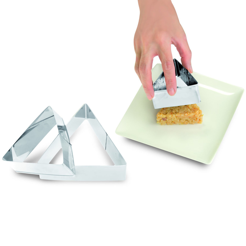 Trzy trójkątne foremki ze stali nierdzewnej do wycinania ciasteczek, bądź układania na talerzu ryżu, makaronu, warzyw, czy owoców. Można myć w zmywarce. Produkt może nosić ślady produkcyjne, które w żaden sposób nie wpływają na jego walory użytkowe. Materiał: stal nierdzewna. Wymiary brutto: 19x16x3,6cm. Wymiary foremek: 11x11x3,5cm; 9x9x3,5cm; 7x7x3,5cm. Waga brutto: 0,090kg. Waga netto: 0,072kg.Bezpieczeństwo - rodzaj ostrzeżenia