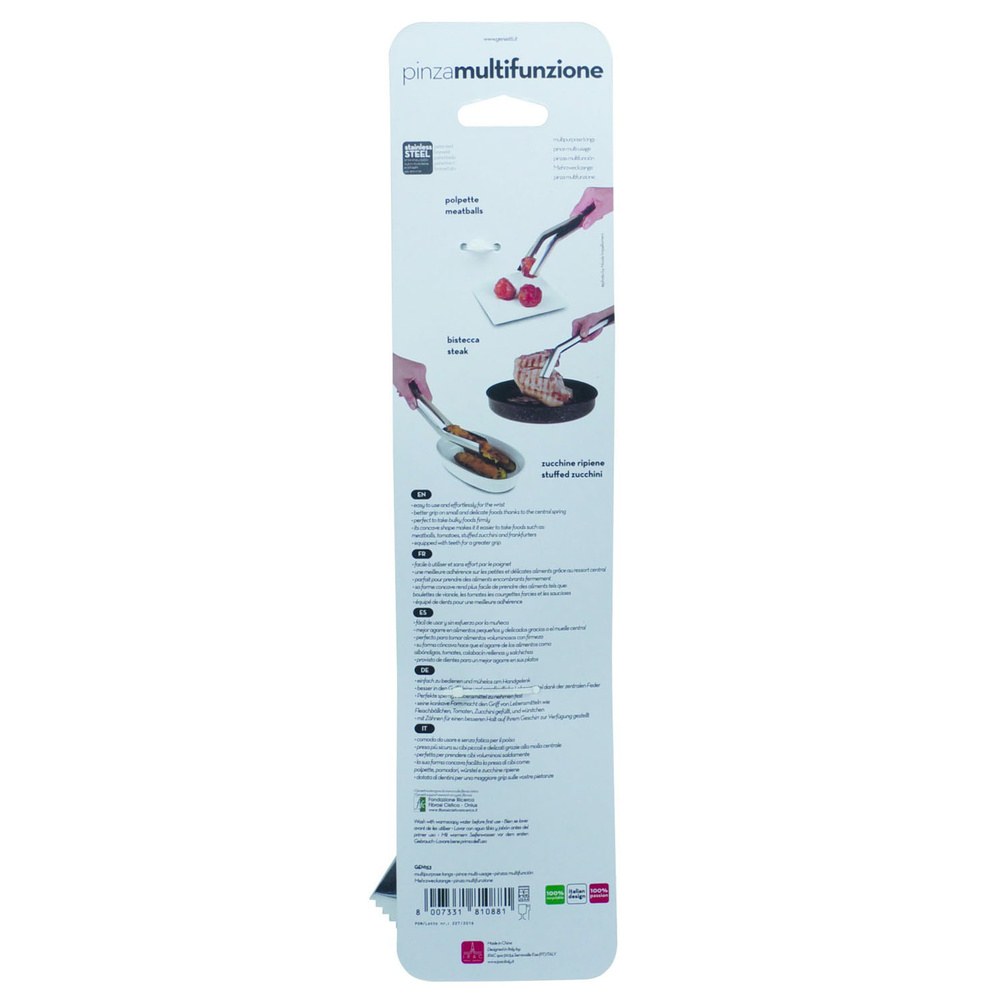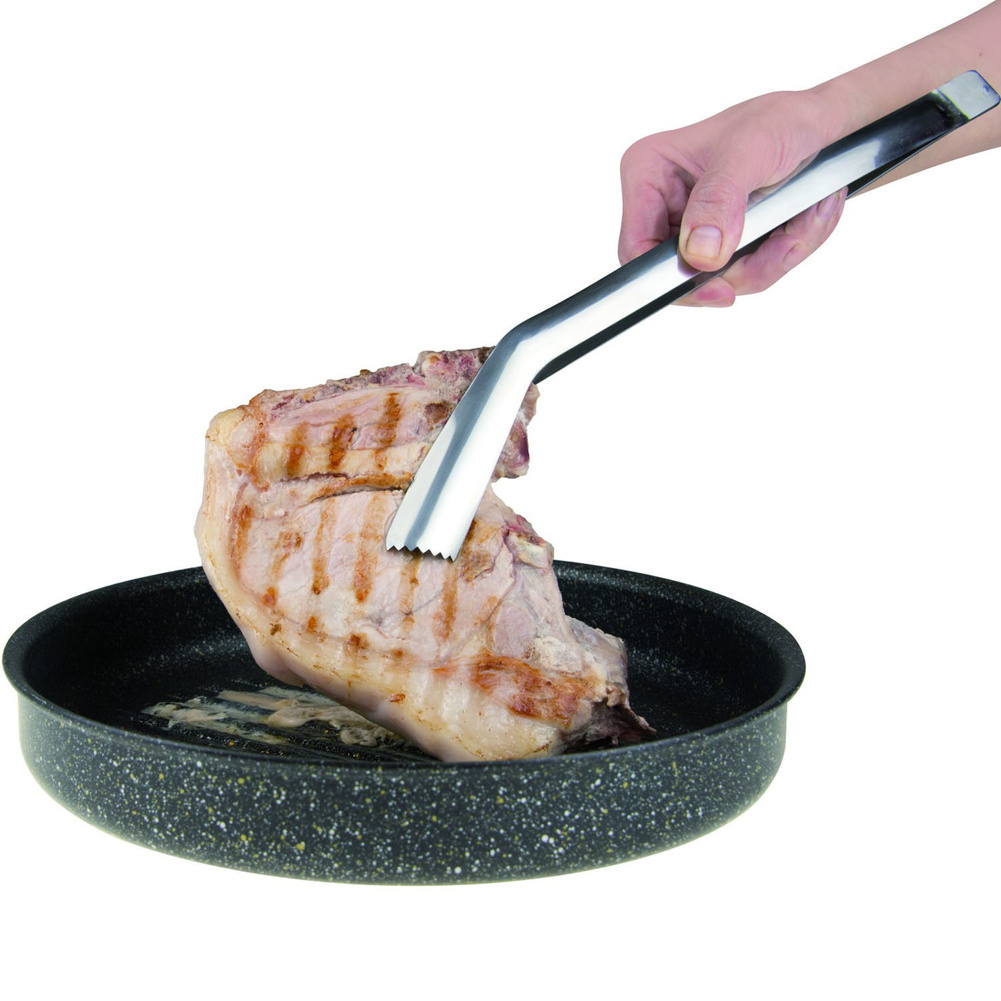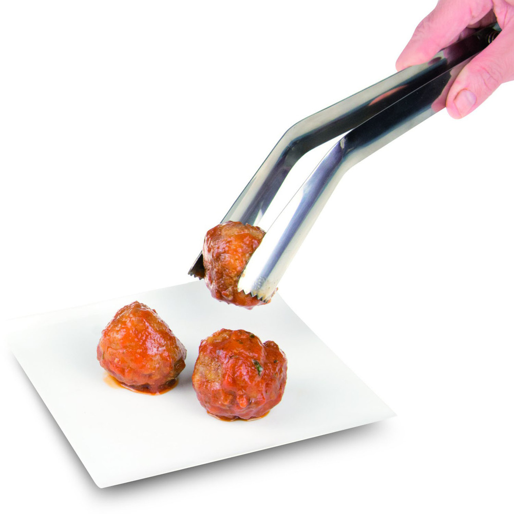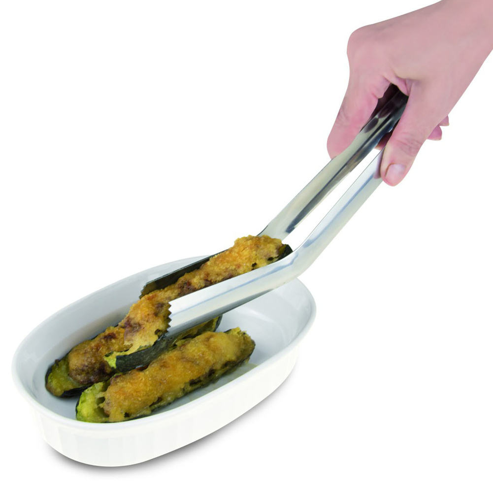 Wielofunkcyjne szczypce ze stali nierdzewnej charakteryzują się wysoką ergonomią użytkowania ze względu na specjalny kąt wygięcia ich ramion - możesz ich wygodnie używać bez nadwyrężania swojego nadgarstka. Sprężyna umieszczona pomiędzy ramionami ułatwia utrzymanie dystansu między nimi, dzięki czemu łatwiej jest chwytać większe kawałki jedzenia, a także te bardzo delikatne, których struktury nie chcemy uszkodzić. Wklęsły kształt na końcach ramion świetnie współgra z kulistością pulpetów czy pomidorów. Oprócz tego pozwalają na wygodne chwytanie jedzenia o cylindrycznych kształtach, które trudno jest chwycić przy pomocy pospolitych narzędzi kuchennych. Idealnie sprawdzi się przy delikatnych i wydłużonych rodzajach jedzenia, jak nadziewana cukinia, które można przewracać bez ich uszkadzania. Ramiona mają dodatkowo na końcach zęby, dzięki którym łatwiej schwycisz jedzenie. Można myć w zmywarce. Produkt może nosić ślady produkcyjne, które w żaden sposób nie wpływają na jego walory użytkowe. Materiał: stal nierdzewna. Wymiary brutto: 35,8x8,3x2cm. Wymiary netto: 30x5,6x1,5cm. Waga brutto: 0,122kg. Waga netto: 0,105kg.