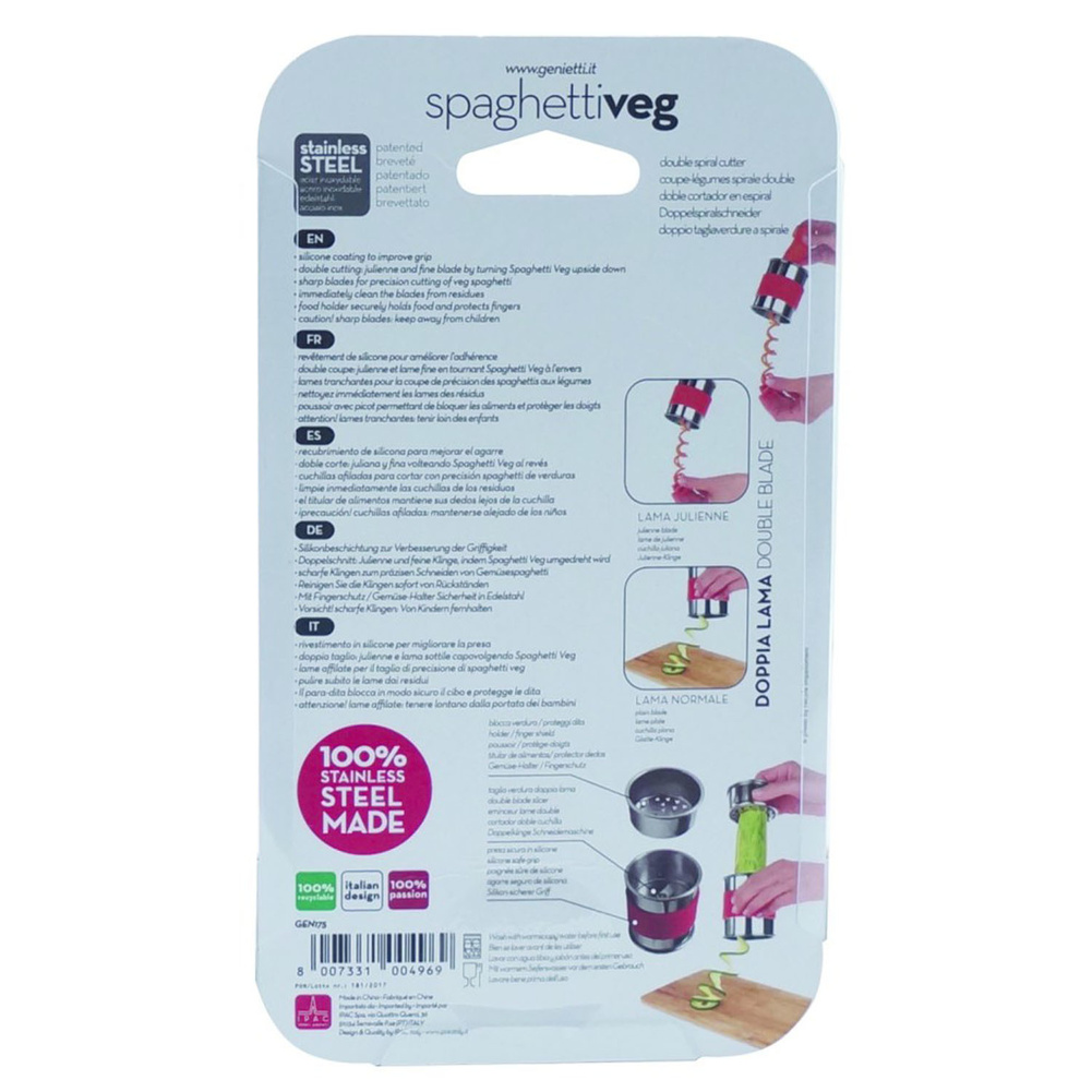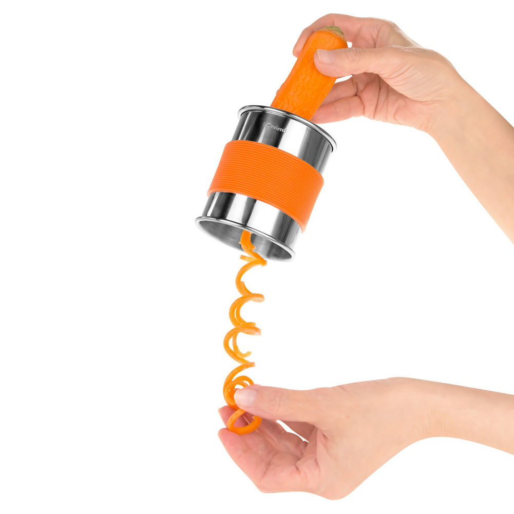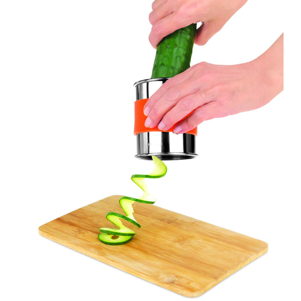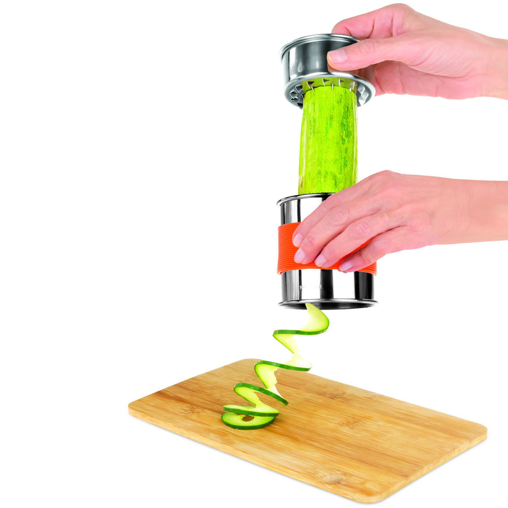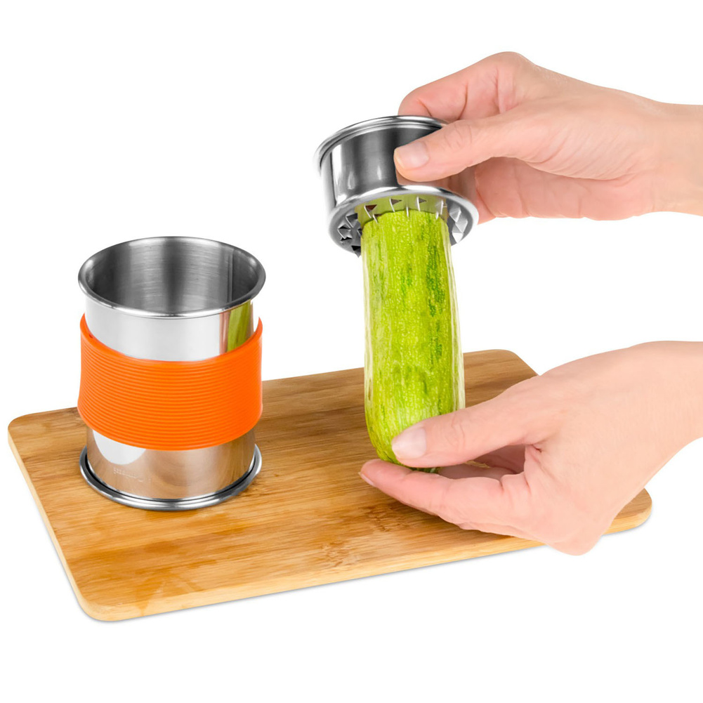 Innowacyjne narzędzie ze stali nierdzewnej z dwoma ostrzami do wycinania spaghetti lub spiralek z takich warzyw jak marchewki, cukinie czy ogórki. Musisz ją mieć, jeśli chcesz przyrządzić ciekawe sałatki lub vegge spaghetti. Na zewnątrz krajalnicy dodano antypoślizgowy silikonowy pierścień, który poprawia trzymanie w narzędzia w dłoni. Oprócz tego, w zestawie zawarty został specjalny blok chroniący palce przed ostrzami. Można myć w zmywarce. Materiał: stal nierdzewna. Wymiary brutto: 19,5x11x7cm. Wymiary netto: 8,3x7cm. Waga brutto: 0,164kg. Waga netto: 0,136kg.