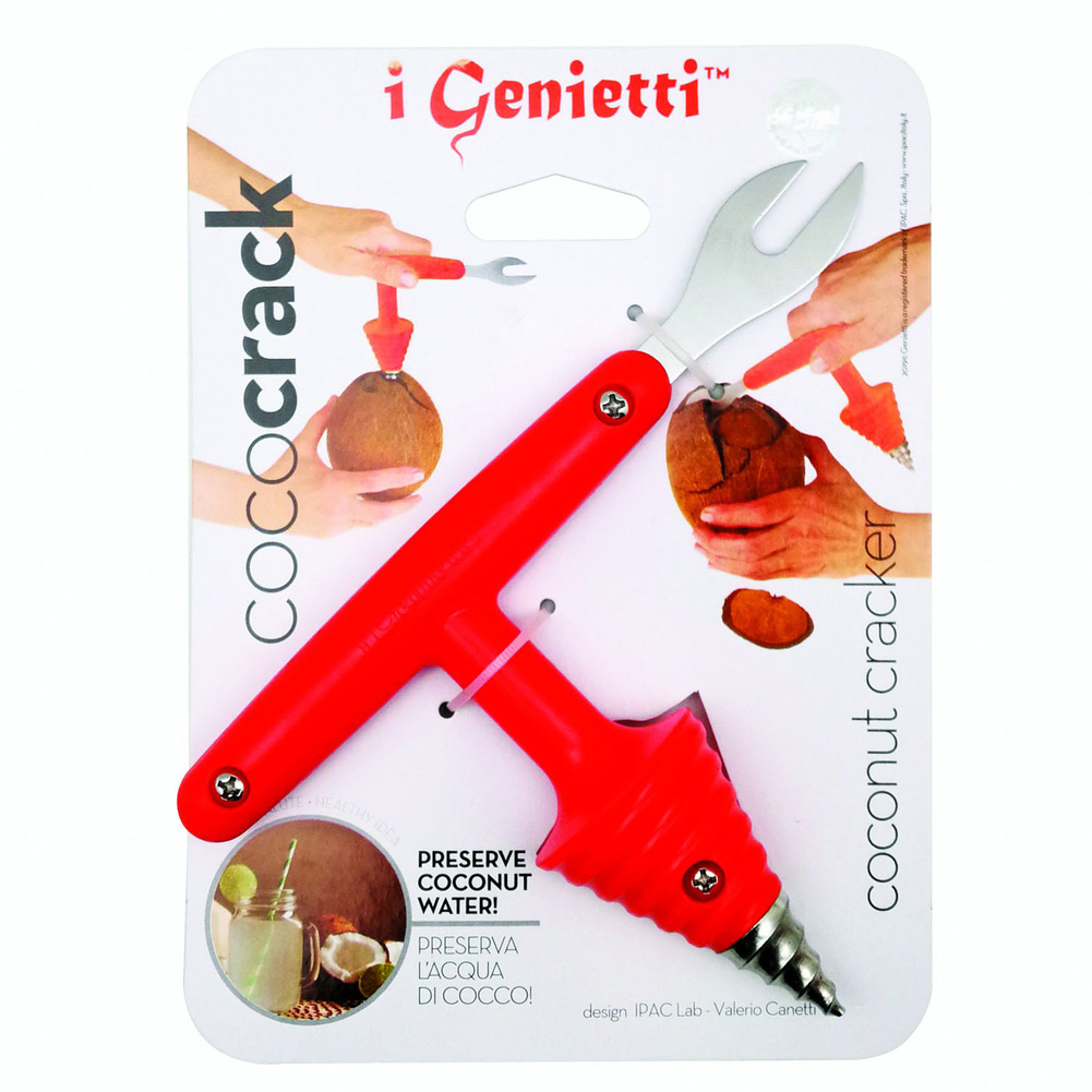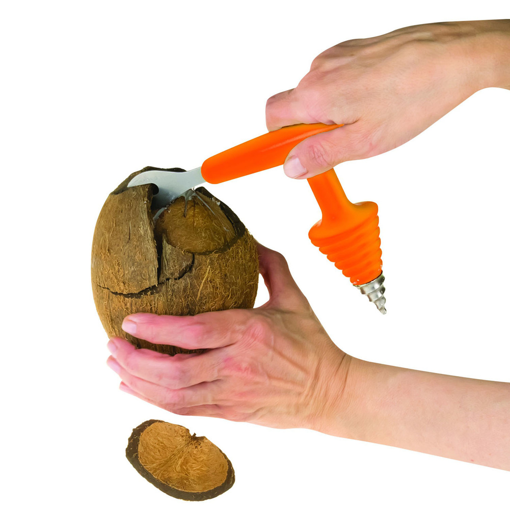 Ten innowacyjny i opatentowany produkt zawiera w sobie dwa narzędzia. Za pomocą jednego można wywiercić w owocu otwór i wylać wodę, natomiast drugie umożliwia rozłupanie kokosa na części i pozyskanie miąższu. Wymiary brutto: 19x14x3,5cm. Wymiary netto: 17,5x12x3,5cm. Waga brutto: 0,099kg. Waga netto: 0,080kg.