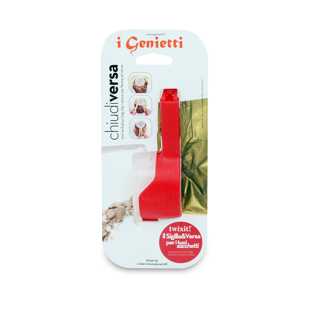 Rozerwane opakowania po kilkukrotnym otwarciu! Porozsypywane produkty! Brak miejsca w szafkach do przechowywania! Klips do torebek z I Genietti ułatwi Ci nie tylko przesypywanie, ale i zminimalizuje przestrzeń w przechowywaniu, koniec z przechowywaniem powietrza w ciężkich i nieporęcznych pojemnikach! Klips nakładamy na otwartą torebkę i zaciskamy. Pasuje do większości standardowych opakowań papierowych i foliowych. Nie trzeba go zdejmować, aby dostać się np. do cukru, mąki itp. Szeroki 5 cm zamykany otwór ułatwia dostęp i przesypywanie. Materiał: tworzywo. Opakowanie: tekturowa zawieszka.Bezpieczeństwo - rodzaj ostrzeżenia