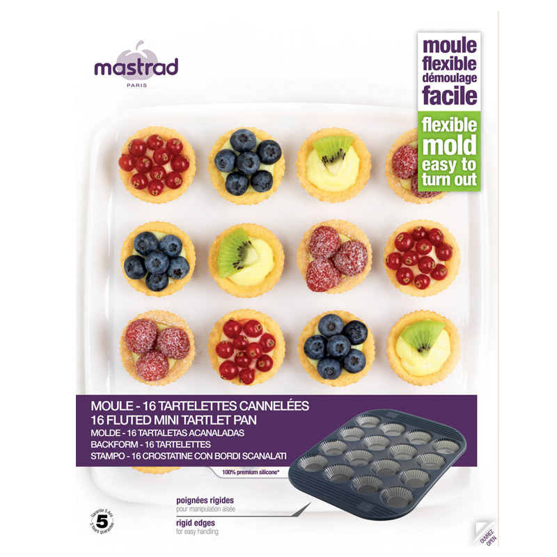 W formie można upiec 16 mini tartaletek. Ciasteczka jak malutkie tarty z nadzieniem słodkim lub słonym. Może służyć również do musów, galaretek i innych małych dań, które powinny trzymać formę.