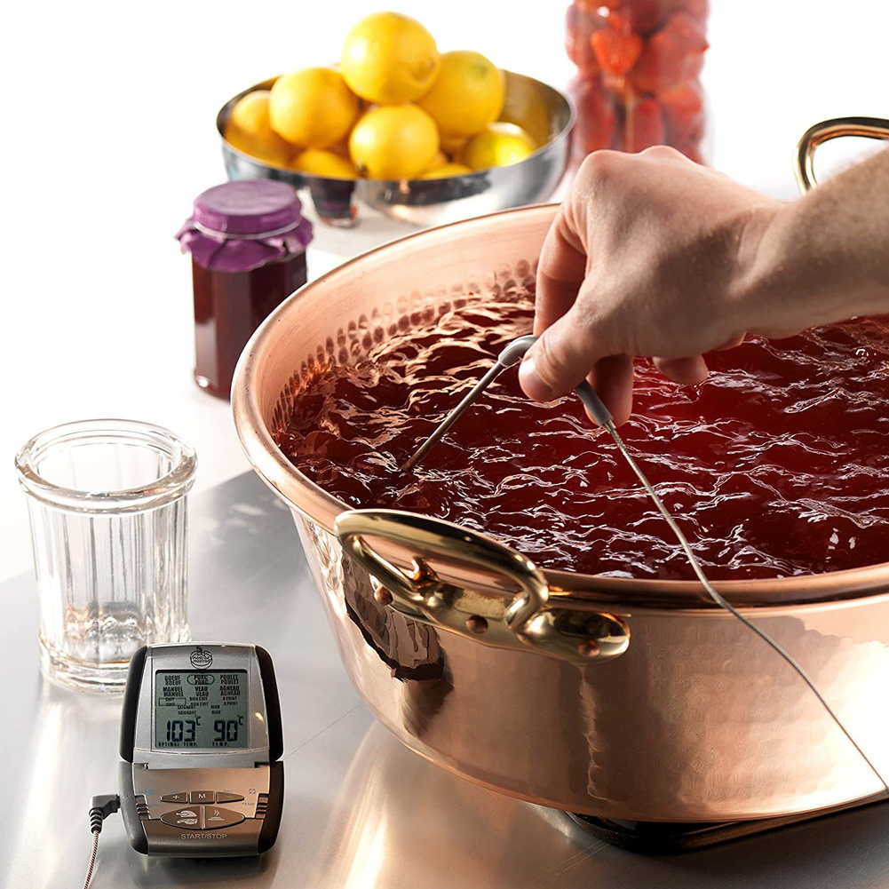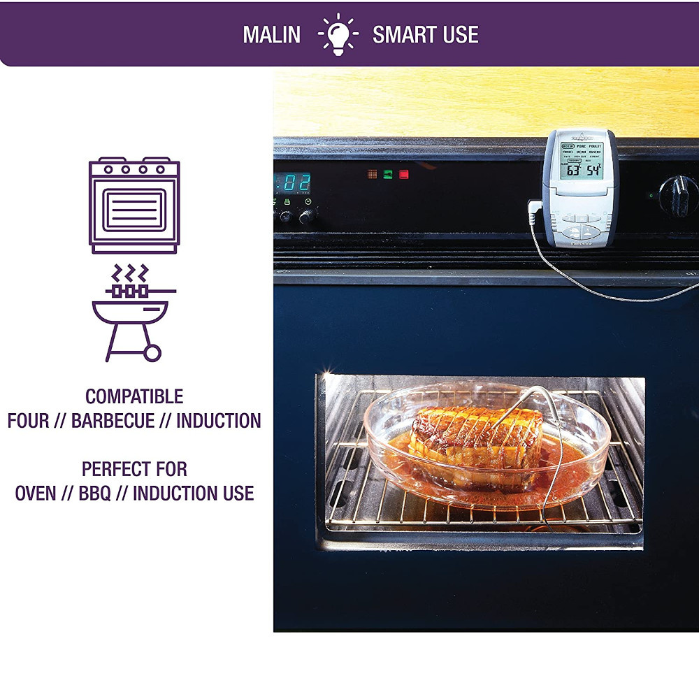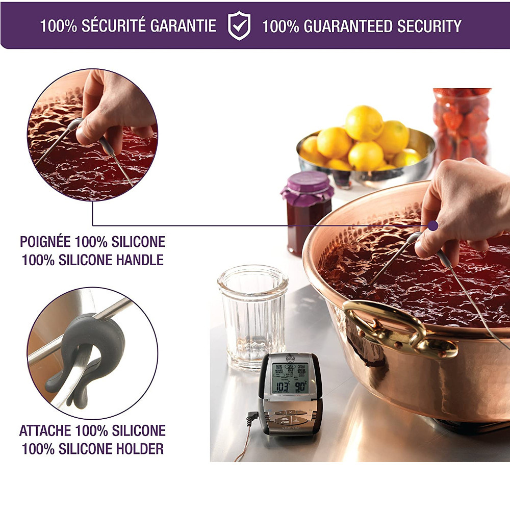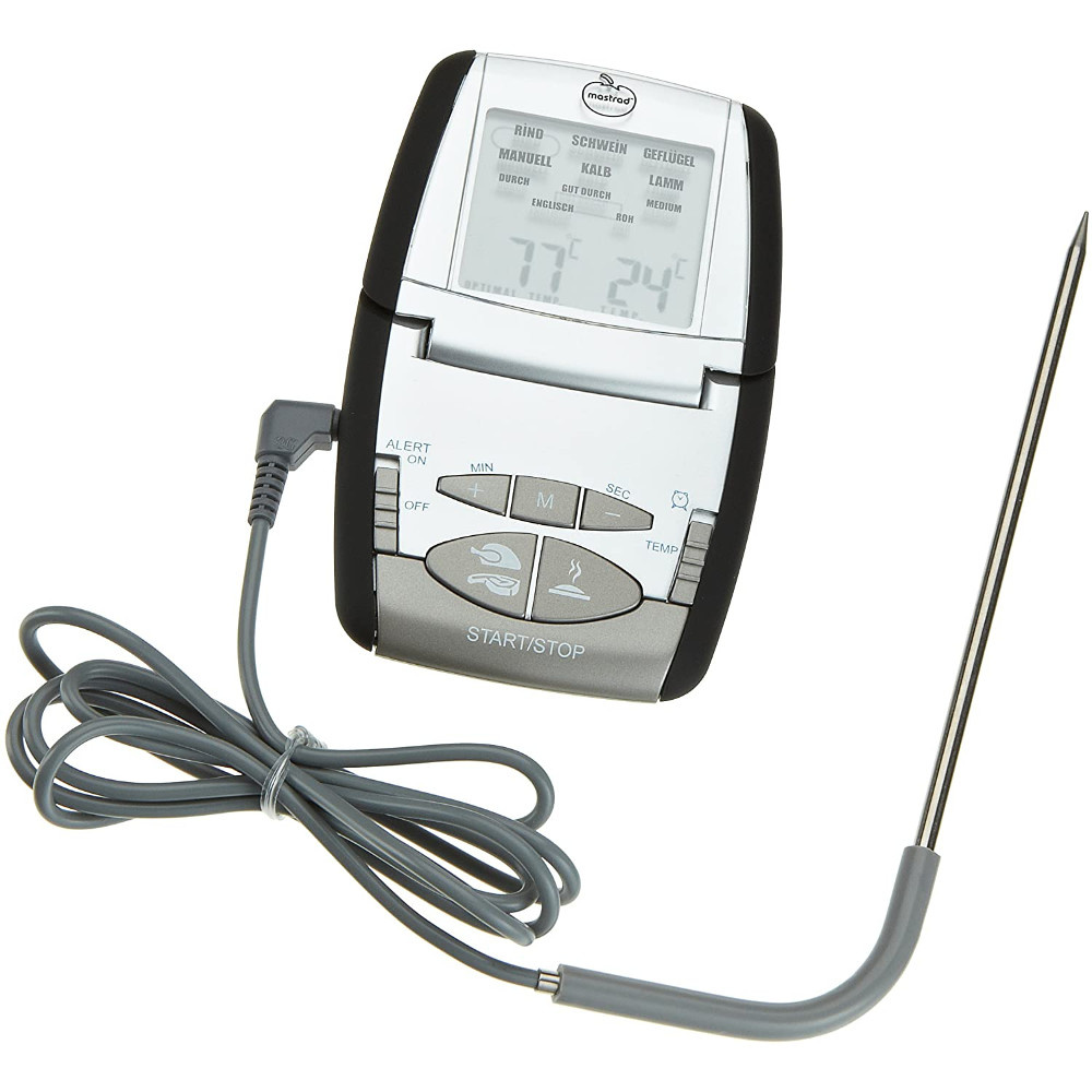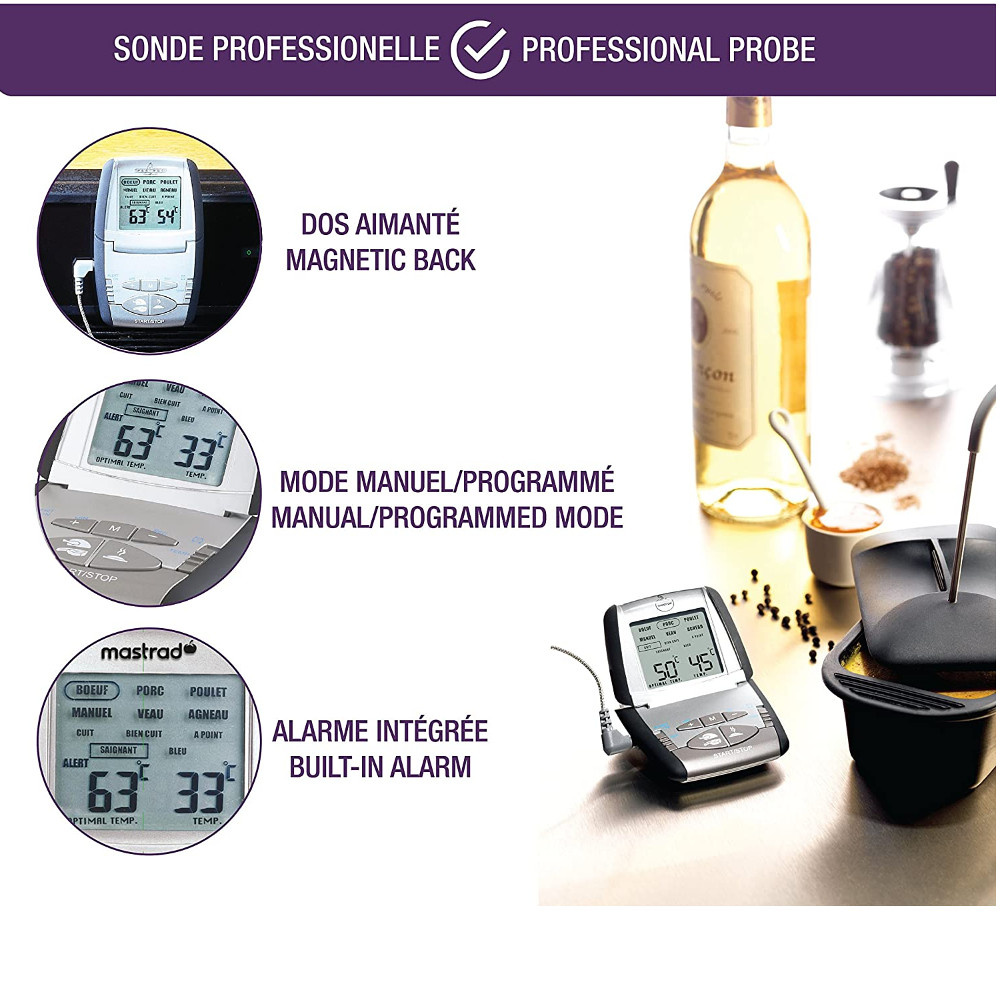 Idealny łosoś, bez zaglądania do piekarnika non stop, rozpływające się foie gras ... przyrządzenie produktów w "punkt" oznacza, że przeszedłeś już 50% drogi do bycia kucharzem. Dzięki termosondzie z Mastrada uchwycisz moment idealnego wysmażenia czy upieczenia a to już połowa sukcesu. Aby przyrządzić średnio wysmażony rostbef, wystarczy wybrać temperaturę lub tryb pieczenia zaprogramowany w urządzeniu, wsunąć sondę w mięso a urządzenie umieścić na zewnątrz bezpośrednio na metalowej obudowie piekarnika. Na tylnej ściance znajdą się 2 silne magnesy, umożliwiające umocowanie na metalowych elementach. Pamiętaj muszą one pozostawać chłodne, nie nagrzewać się w trakcie pieczenia. Po osiągnięciu pożądanego stopnia przyrządzenia rozlegnie się alarm. Sonda sprawdzi się również przy robieniu konfitur i dżemów, praktyczny klips pozwoli umieścić sondę na garnku. Uwagi dotyczące użytkowania: Sondę należy umieszczać w środku przygotowanej potrawy, nie na brzegu. Przed rozpoczęciem pomiaru należy upewnić się, że sonda jest zimna, a następnie wyjąć i włożyć baterię. Sondę i kabel czyścimy wilgotną ściereczką, nie należy zanurzać w wodzie urządzenia. Nie wolno wkładać urządzenia do piekarnika, powinno ono pozostawać na zewnątrz: w piekarniku pozostaje sonda i kabel łączący z urządzeniem bazowym. Nie dotykaj sondy i kabla wyjmując z piekarnika, są one gorące i możesz poparzyć się. Urządzenie przeznaczone jest do mierzenia temperatury, maksymalnie do 210 stopni Celsjusza. Jeżeli użyjesz urządzenia powyżej tej temperatury, urządzenie wyświetli komunikat "HI" a gwarancja straci ważność.Urządzenie działa na baterię R03(AB) AAA 1,5 V ( 1 w zestawie). Korzystanie ze wstępnie zaprogramowanych czasów i temperatur Przed rozpoczęciem pracy umieść na ekranie w wybranym języku menu do wyboru: hiszpański, francuski, niderlandzki,włoski, niemiecki lub angielski, brak w języku polskim, to Ci zdecydowanie ułatwi pracę z urządzeniem. W menu znajdziesz: rodzaje mięs i stopień wysmażenia/upieczenia oraz funkcję manual do ręcznego ustawiania czasu i temperatury. Do wyboru: wołowina, wieprzowina drób, cielęcina i jagnięcina, stopnie to: done, well, medium med, rare i rare. Wybierz rodzaj mięsa używając przycisku A, stopień przyrządzenia - B, alarm włączysz suwakiem C. Umieść sondę w mięsie przed włożeniem do piekarnika, mierzenie temperatury uruchamiasz przyciskiem E. Po osiągnięciu odpowiedniego stopnia przyrządzenia w urządzeniu włączy się alarm Ręczne ustawianie czasu i temperatur Wybierz temperaturę za pomocą suwaka D i włącz urządzenie przyciskiem suwakiem C - pozycja ON, wybierz z Menu funkcję MANUAL używając przycisku A a następnie naciśnij M wyświetli się temperatura +/- pozwoli Ci wybrać pożądaną, zatwierdź za pomocą M. Umieść sondę w mięsie przed włożeniem do piekarnika, mierzenie temperatury uruchamiasz przyciskiem E. Analogicznie ustawiasz alarm.Bezpieczeństwo - rodzaj ostrzeżenia
