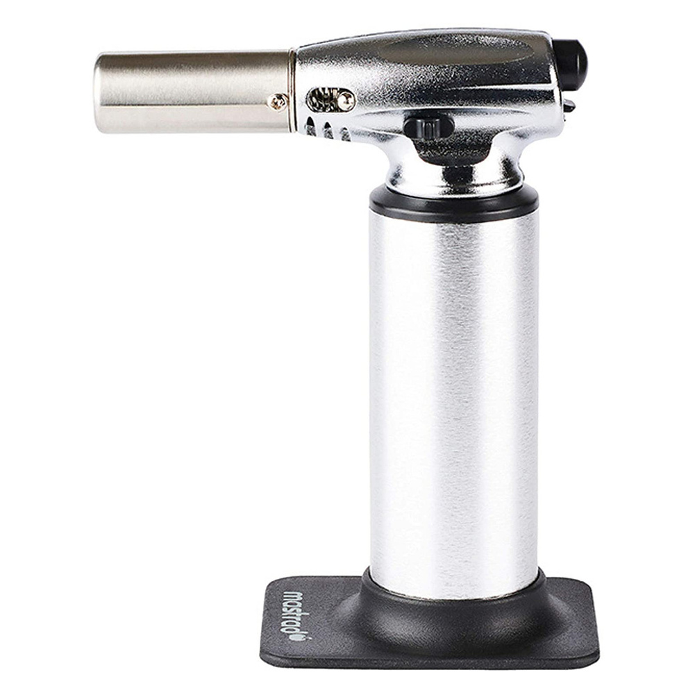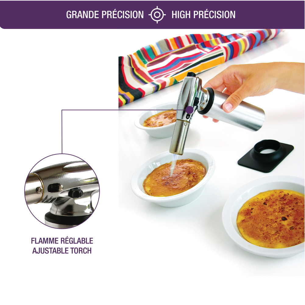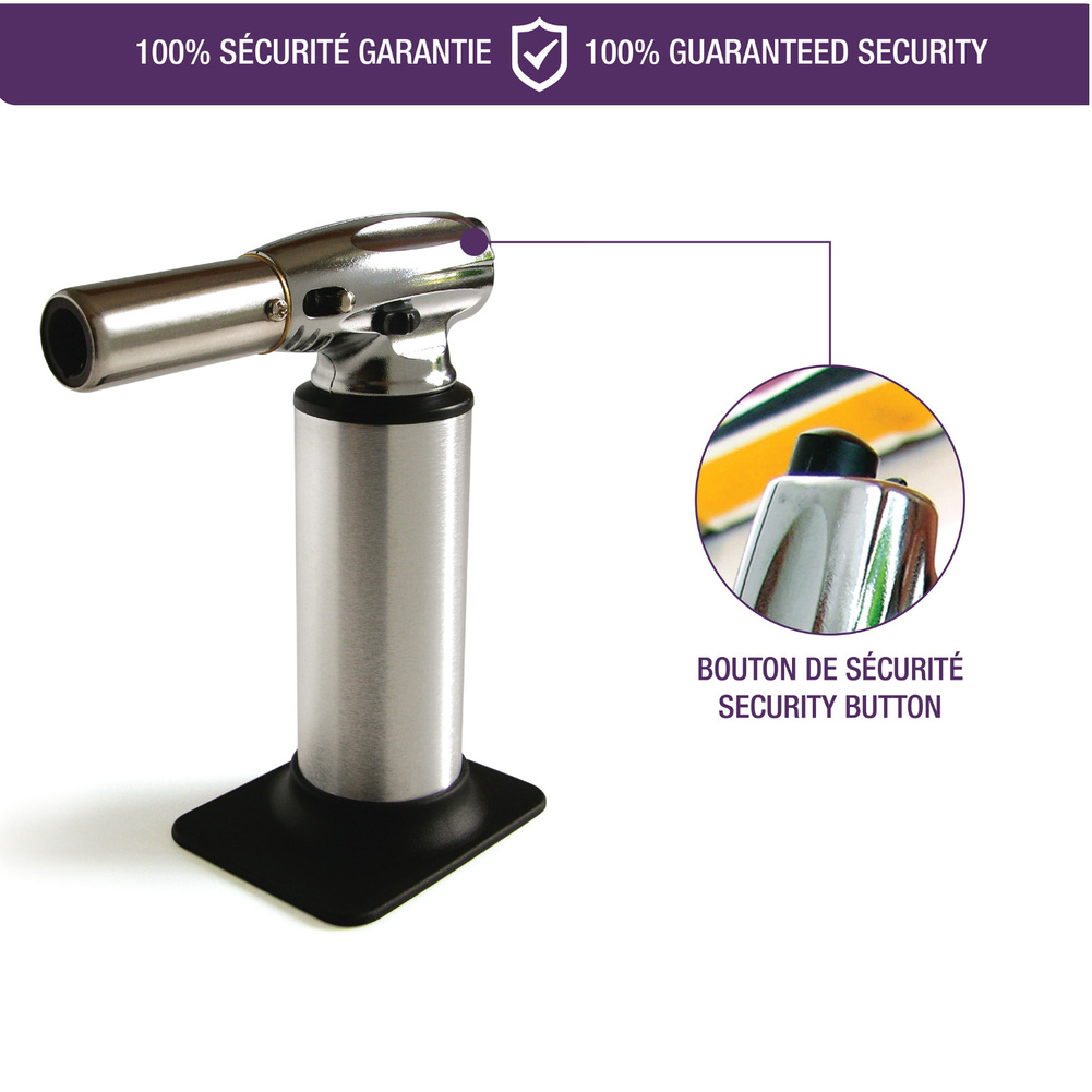 Palnik profesjonalny - opalarka do flambirowania ze stopką chrom z czarnym wykończeniem. Palnik -opalarka idealnie sprawdzi się do karmelizacji kremów i deserów , a nawet opalania - obierania warzyw tj. papryka, pomidory, cebula oraz zamykania mięs. Pojemność palnika to 36 ml gazu co starcza na ok 45 minut pracy. Palnik nie jest napełniony gazem. Zawór do napełniania gazem znajduje się na spodzie palnika. Przed napełnianiem gazem upewnij się, że zawór i dysza pojemnika z gazem są ściśle do siebie spasowane. Używaj gazu dobrej jakości. Przed napełnianiem potrząśnij kilka razy pojemnikiem. Przesuń suwak regulacji płomienia - na załączonej instrukcji obrazkowej oznaczony numerem 2- do pozycji "-" Dyszę pojemnika wsuń prostopadle w zawór. Po napełnieniu urządzenia odczekaj kilka minut, aż gaz ustabilizuje się. Aby rozpocząć pracę z palnikiem: - przesuń suwak regulacji płomienia - na załączonej instrukcji obrazkowej oznaczony numerem 2- do pozycji "+", - odblokuj, przesuwając w dół dźwignię bezpieczeństwa - znajduje się ona z tyłu palnika pod guzikiem startera - na obrazkowej instrukcji oznaczona jest nr 3, - naciśnij starter - na obrazkowej instrukcji oznaczony nr 6, guzik startera nie wciśnie się, jeżeli nie odblokujemy go najpierw dźwignią bezpieczeństwa. Guzik startera należy wcisnąć do końca, jeśli nie będzie dobrze wciśnięty palnik zablokuje się. Należy wtedy ponownie przesunąć dźwignię bezpieczeństwa. Każde zwolnienie startera powoduje zablokowanie urządzenia. Uwagi dotyczące użytkowania palnika: - długość płomienia regulujemy suwakiem z prawej strony palnika - oznaczonym na rysunku nr 2 - przesuwając w kierunku "+" wydłużamy płomień, w kierunku "-" zmniejszamy. Zaleca się tak wyregulować płomień, aby nie był dłuższy, niż połowa końcówki palnika 10 do 25 mm- oznaczona na rysunku nr 1. Pracując z dłuższym płomieniem marnujesz paliwo a płomień jest niestabilny. - szerokość płomienia podczas pracy regulujemy kontrolerem wlotu powierza oznaczony nr 4, umieszczony z obu stron palnika, przesuwamy go palcem do przodu. Zaleca się regulować szerokość powoli, z zachowaniem ostrożności, trzymając palnik w bezpiecznej odległości. - aby pracować nieprzerwanie przesuń kontroler z lewej strony palnika - na rysunku oznaczony nr 5, uwaga aby, osiągnąć najlepszy rezultat, suwak długości płomienia powinien być ustawiony w połowie. Jeśli będzie ustawiony w pozycji maksymalnej opalarka może nie pracować właściwie. Ważne, aby zakończyć pracę z zablokowanym palnikiem w trybie pracy ciągłej, należy przesunąć guzik nr 5 do przodu. Zablokowanie płomienia: - zwolnić blokadę przesuwając w dół rysunek nr 2, - wcisnąć starter rysunek nr 3, - przesunąć włącznik nr 5 do siebie rysunek nr 4, - płomień ciągły rysunek nr 5, - zwolnienie włącznika ciągłego płomienia przez przesunięcie do przodu rysunek nr 6.