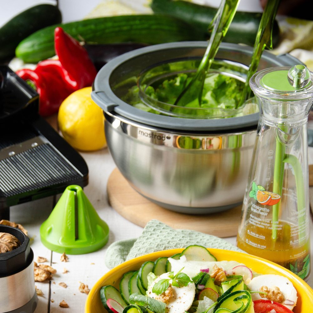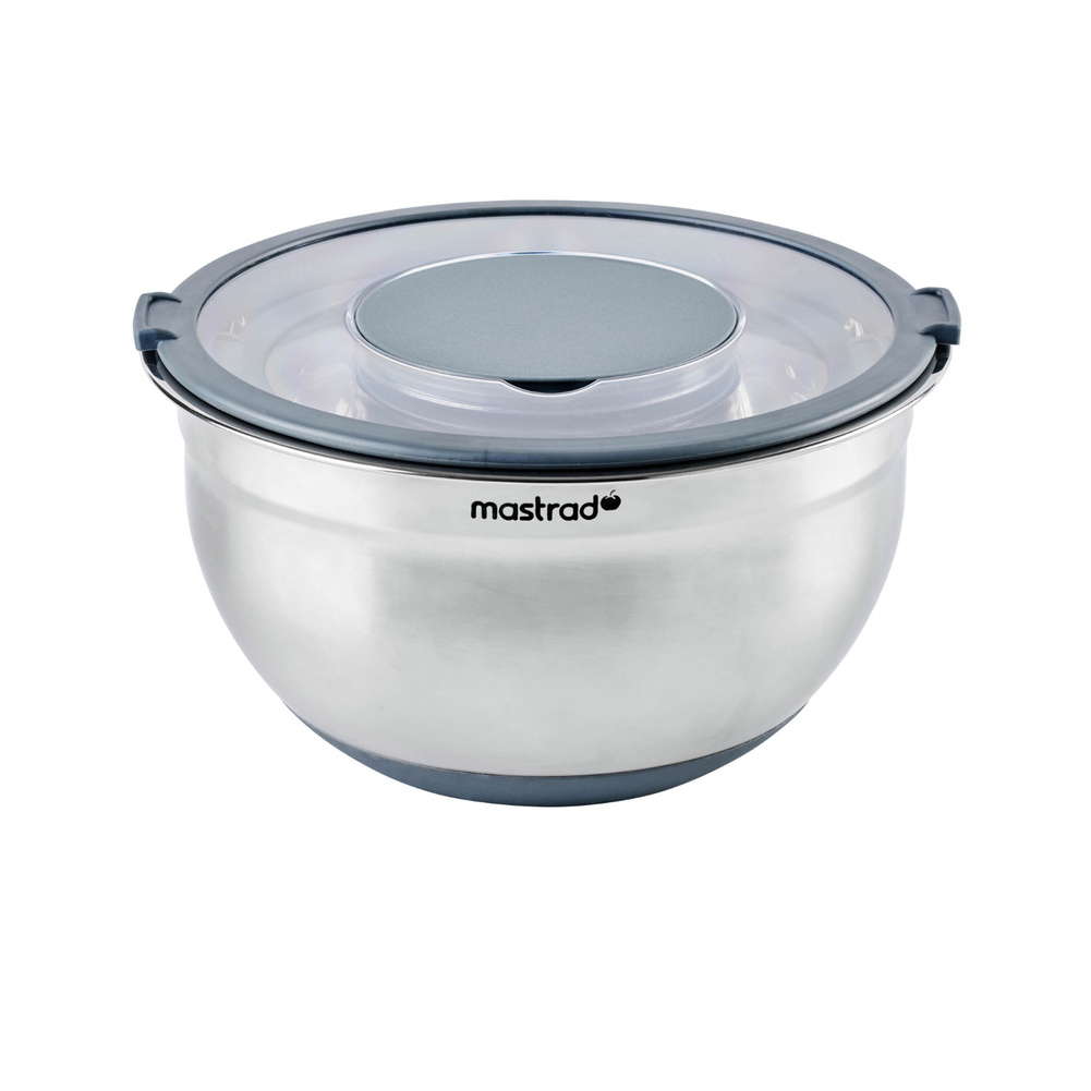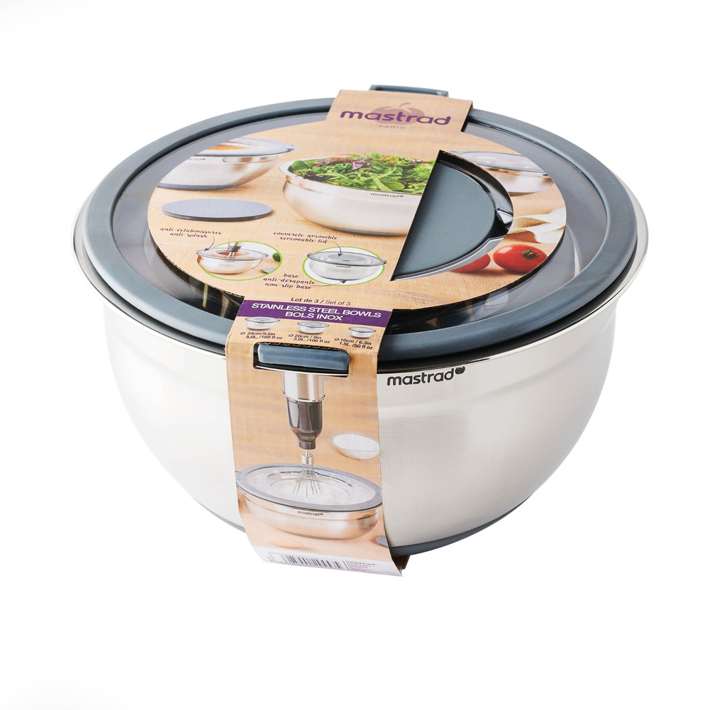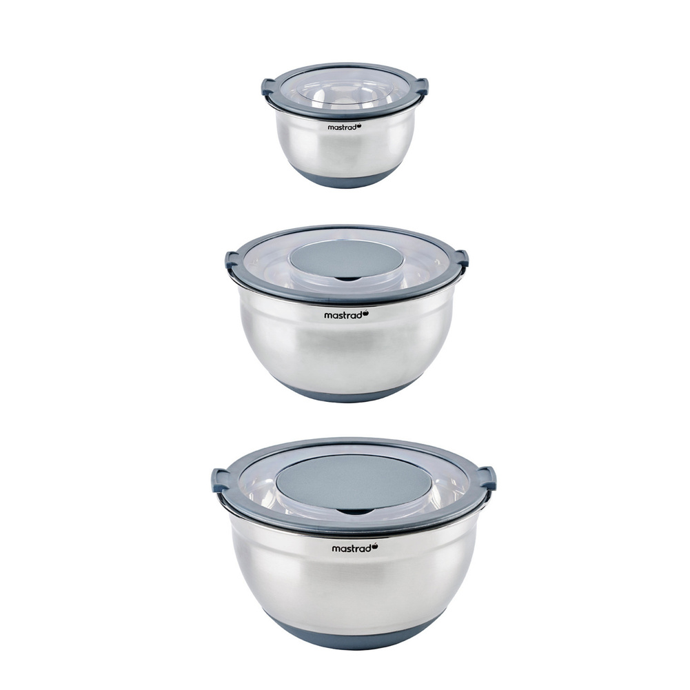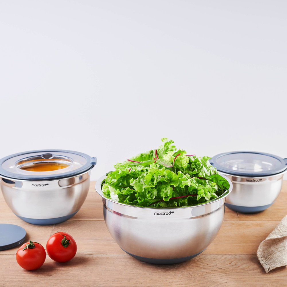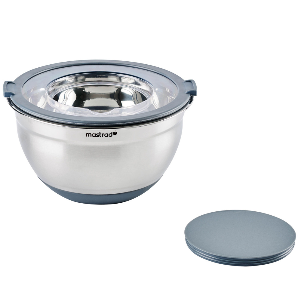 W skład zestawu wchodzi: - stalowa misa o średnicy 24cm o pojemności 5L, - stalowa misa o średnicy 20cm o pojemności 3L, - stalowa miska o średnicy 16cm o pojemności 1,5L. Miski można wykorzystać do przyrządzania, serwowania i przechowywania! Naczynia zostały wykonane z dbałością o szczegóły. Szary silikon na dole, szczotkowany pas stali powyżej, przezroczysta pokrywa z silikonowym brzegiem sprawia, że jest to przedmiot nie tylko funkcjonalny, ale i dobrze prezentujący się. Środkową część przezroczystej pokrywy w miskach o średnicy 24cm i 20cm można wyjąć. W tak powstałe okienko o średnicy 12 centymetrów bez problemu włożysz blender i zmiksujesz zawartość. Silikonowy spód pewnie trzyma misę w miejscu, a pozostała część pokrywy chroni przed rozpryskami. Pokrywa wykona z przezroczystego tworzywa pozwala kontrolować proces rozdrabniania. Na wewnętrznej ściance misek umieszczono skalę w litrach i kwartach.