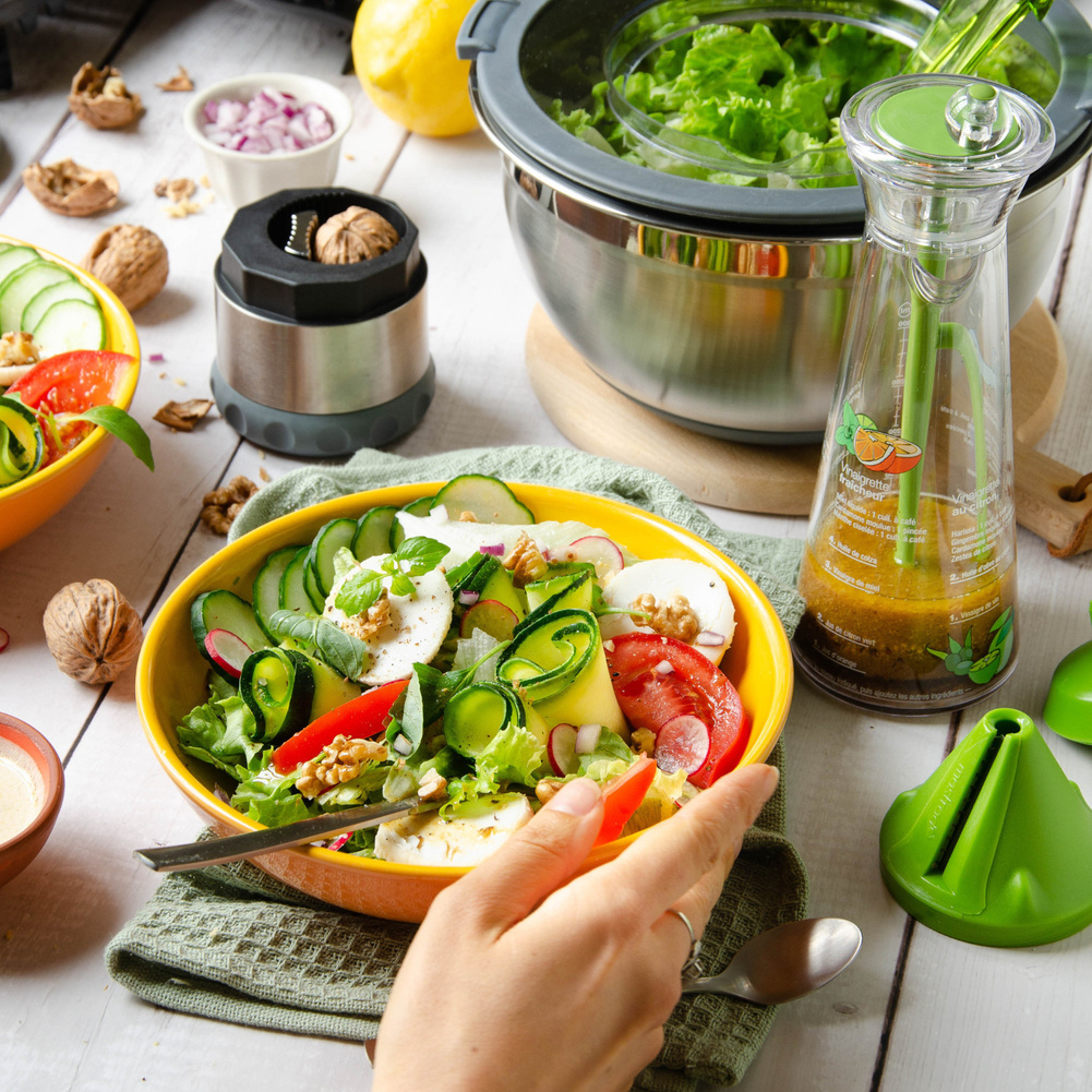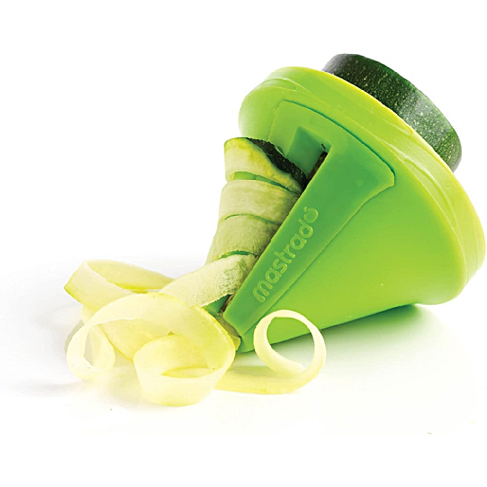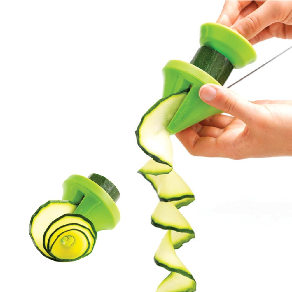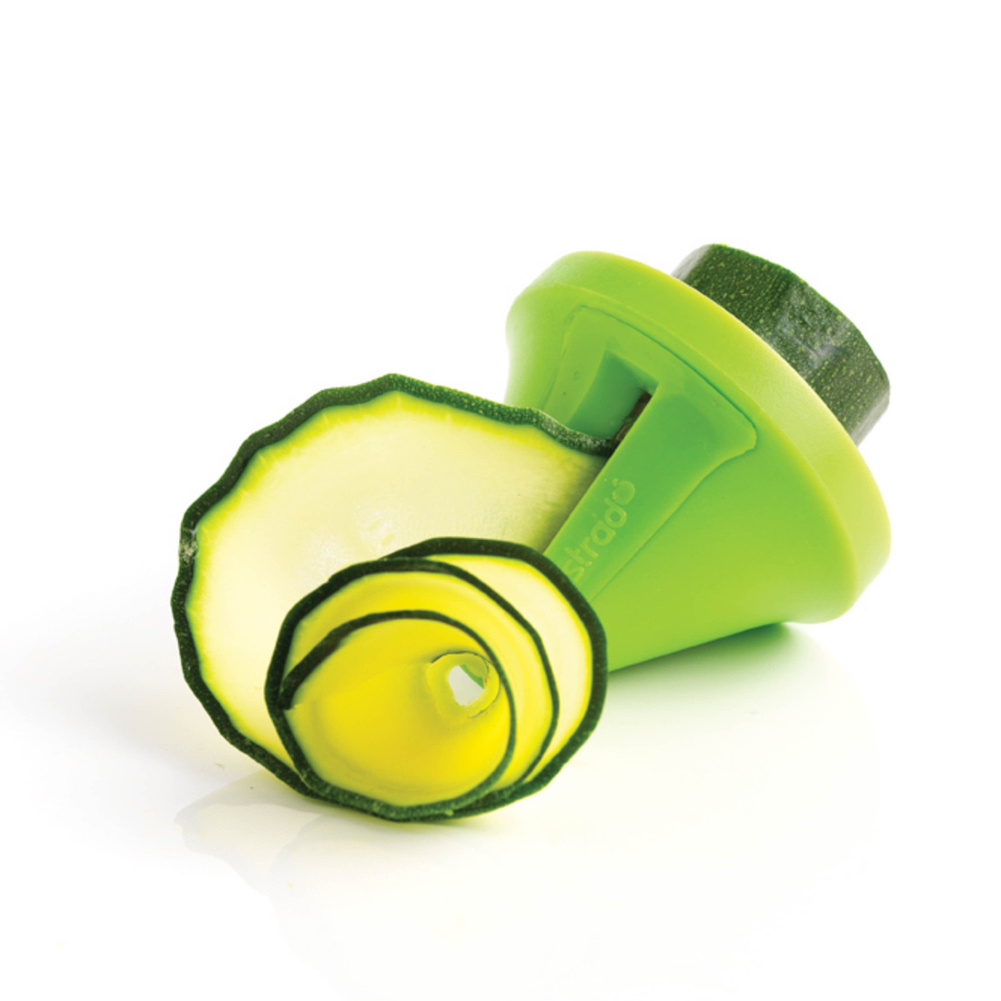Dwie krajalnice do warzyw wyposażone w różne ostrza. Nowy pomysł na krojenie warzyw. Dwa ostrza umożliwiają pokrojenie warzyw w paseczki oraz w szerokie wstążki. Krajalnica pozwala zrobić „makaron” z warzyw, szybko pokroić je do sałatek, zup, sosów. Pora na pyszne tagliatelle z cukinii i bucattini z pietruszki, marchewki lub rzodkwi. Krajalnica ma kształt stożka, do którego wkłada się warzywo, np. cukinię lub marchewkę. Krajalnicę lub warzywo należy obracać, a zamontowane wewnątrz ostrze pokroi je na wybrany kształt. Działa podobnie, jak temperówka. Krajalnica ma również specjalną przystawkę ze szpikulcami, na które można nabić warzywo. W ten sposób można je bezpiecznie kroić, bez groźby przypadkowego skaleczenia. W zestawie jest również specjalna szczoteczka do czyszczenia wnętrza krajalnicy. Końcówki można wkładać jedną w drugą, co pozwala zachować porządek i nie gubić części. Można myć w zmywarce, ale zaleca się mycie ręczne. Ostrza zostały wykonane ze stali nierdzewnej. Przybliżone wymiary brutto: - wysokość 17cm, - długość 12,1cm, - szerokość 7,5cm. Przybliżona waga brutto: 0,131kg. Opakowanie: tekturowa zawieszka, blister.