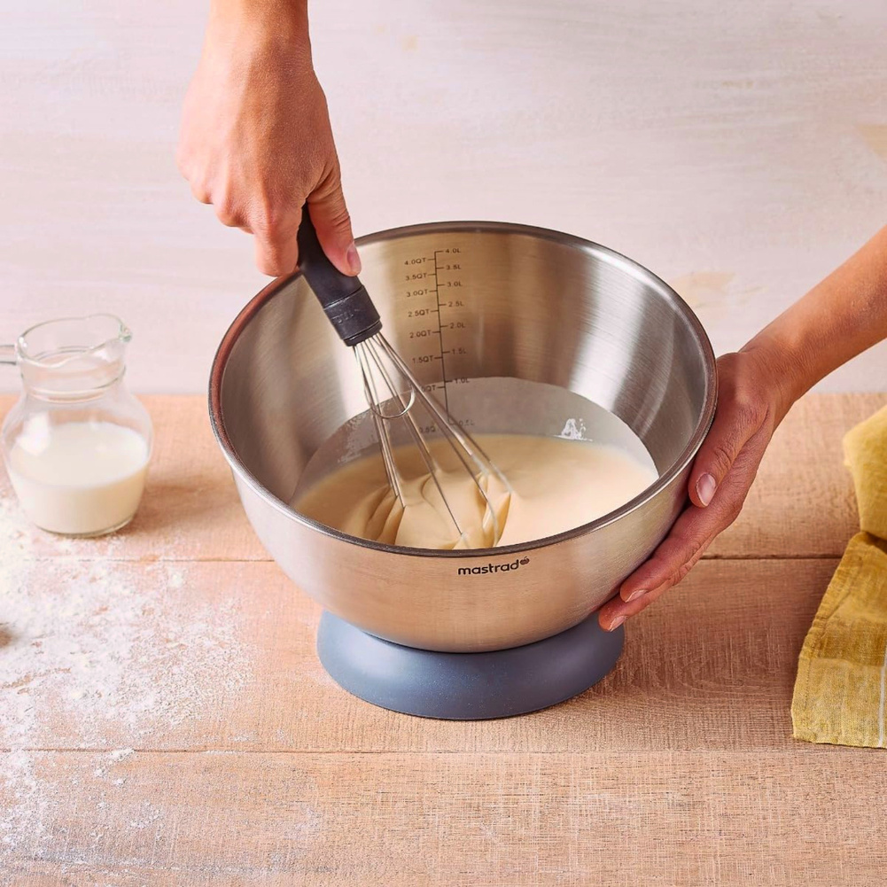 Misę można wykorzystać do przyrządzania na gorąco i zimno sosów, kremów, ciast! Naczynie zostało wykonane z dbałością o szczegóły. Szczotkowana stal, funkcjonalna podziałka z boku w kwartach i litrach, zaokrąglony spód oraz stabilna, antypoślizgowa podstawka, która umożliwia dobranie odpowiedniego kąta nachylenia podczas miksowania sprawia, że misa to absolutny must have w kuchni. Materiał: stal nierdzewna inox 18/8, silikon, tworzywo. Przybliżone wymiary stalowej misy: - wysokość 14cm, - średnica zewnętrzna 25,5cm, - średnica wewnętrzna 24cm. Przybliżone wymiary podstawy: - wysokość 3cm, - średnica góra 13cm, - średnica dół 16cm. Przybliżone wymiary brutto: - wysokość 27cm, - długość 26cm, - szerokość 14,5cm. Przybliżona waga brutto: 0,751kg. Opakowanie: kolorowy karton.Bezpieczeństwo - rodzaj ostrzeżenia
