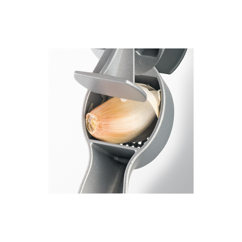 Praska do czosnku GALIEN pokryta powłoką zapobiegającą przywieraniu pozwala szybko i bez problemu zgnieść czosnek. Praska pewnie leży w dłoni i jest wyjątkowo lekka, ponieważ została wykonana z aluminium. Pokrycie praski powłoką nieprzywierającą przeciwdziała przyleganiu czosnku do ścianek. Dzięki temu czyszczenie praski jest proste. Dodatkowo pomaga w tym specjalna stopka, która pomaga oczyścić otwory praski z pozostałego tam czosnku. Zaleca się myć ręcznie Materiał: aluminium Przybliżone wymiary: wysokość 5 cm, długość 15,5 cm, szerokość 3,6 cm Przybliżone wymiary brutto: wysokość 24 cm, długość 5,5 cm, szerokość 4,2 cm Przybliżona waga brutto: 0,133 kg Opakowanie: karton zawieszka