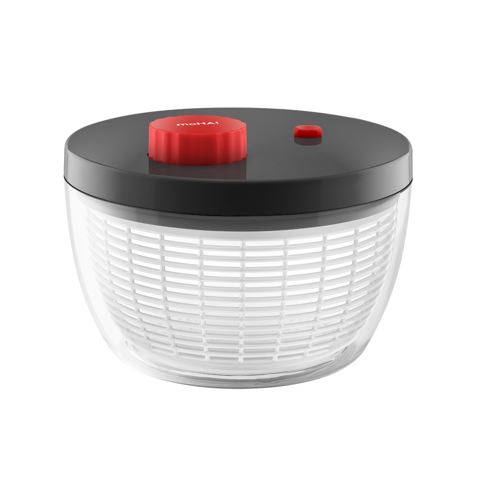 Dzięki zupełnie nowemu, opatentowanemu mechanizmowi wirowanie sałaty stało się proste. Wystarczy obrócić pokrętło obrotu (większy, czerwony przycisk na pokrywie) 2–3 razy, a kosz zacznie się obracać z dużą prędkością. Mały przycisk służy do przerwania wirowania. Miska posiada antypoślizgową podstawę i może służyć również jako elegancka salaterka. Kosza możemy używać jako durszlaku do odcedzania i płukania. Materiał: ABS, PP, SAN, silikon. Przybliżone wymiary: - wysokość: 18cm, - średnica góra: 24,7cm, - średnica dół: 18cm. Przybliżone wymiary brutto: - wysokość: 25,7cm, - długość: 18,8cm, - szerokość: 25,8cm. Przybliżona waga brutto: 1,374kg. Opakowanie: kartonowe pudełko prezentowe.Bezpieczeństwo - rodzaj ostrzeżenia