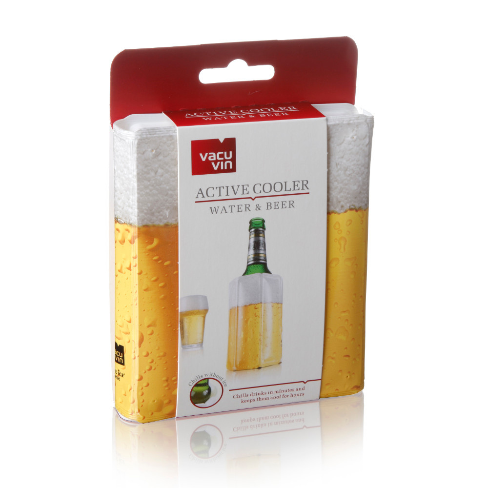 Aktywny schładzacz przypomina rękaw, który nasuwa się bezpośrednio na butelkę. W środku jest wypełniony wkładem chłodzącym, zaś na zewnątrz ma fotografię piwa z pianką.