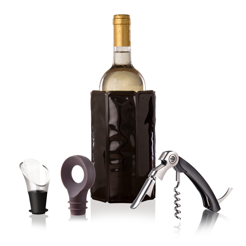 W skład zestawu wchodzi: aktywny schładzacz czarny, brązowy silikonowy korek, korkociąg kelnerski, nalewak kryształ. Aktywny schładzacz przypomina rękaw, który nasuwa się bezpośrednio na butelkę. W środku jest wypełniony wkładem chłodzącym. Aktywny schładzacz w ciągu 15 minut oziębia wino. Nie ma więc potrzeby długotrwałego chłodzenia w lodówce. Wino pozostaje zimne przez kilka godzin. Nieużywany należy przechowywać w zamrażalniku. Pasuje na butelki od 0,7 do 1 litra. Klasyczny korkociąg kelnerski, używany w restauracjach, gdzie podaje się dobre wino. Jego działanie oparte jest na mechanizmie umieszczonym w zawiasie, co pozwala odkorkować butelkę szybko i bez wysiłku. Korkociąg jest lekki i nie zajmuje dużo miejsca. Równie łatwo przechowywać go w szufladzie, jak i kieszeni. Dodatkowo w rączce korkociągu znajduje się przecinak do folii oraz otwieracz do kapsli. Nalewak do wina z silikonową uszczelką, dzięki elastycznej konstrukcji dopasowuje się do większości butelek. Ułatwia nalewanie wina i zapobiega kapaniu. Korek prosty użyciu, trwały i bezpieczny. Pasuje do większości butelek. Zestaw zapakowany jest w eleganckie pudełko kartonowe z okienkiem. To doskonały pomysł na prezent dla tych, którzy właśnie zaczynają swoją przygodę z winem. Materiał: guma, tworzywo sztuczne, silikon.