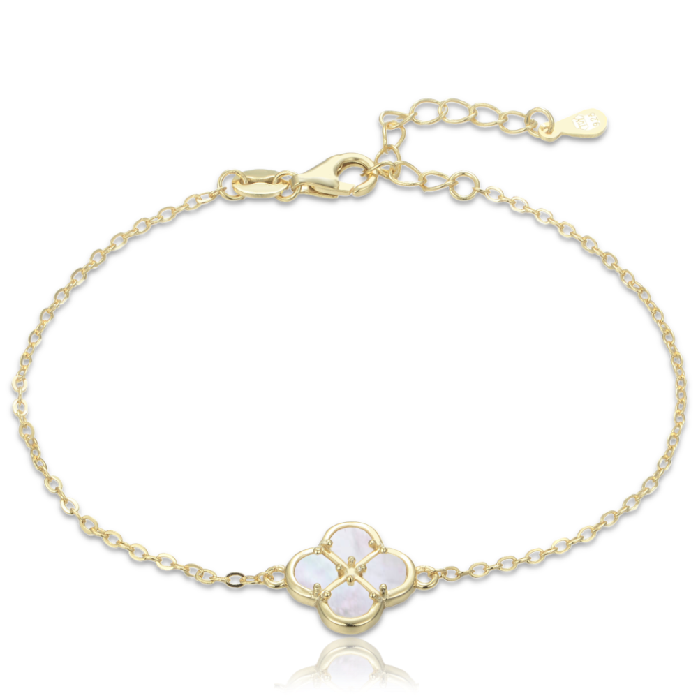 MINET Pozłacana srebrna bransoletka koniczyna z białą masą perłową