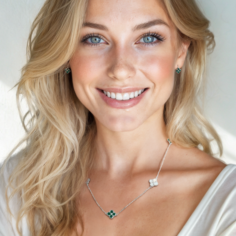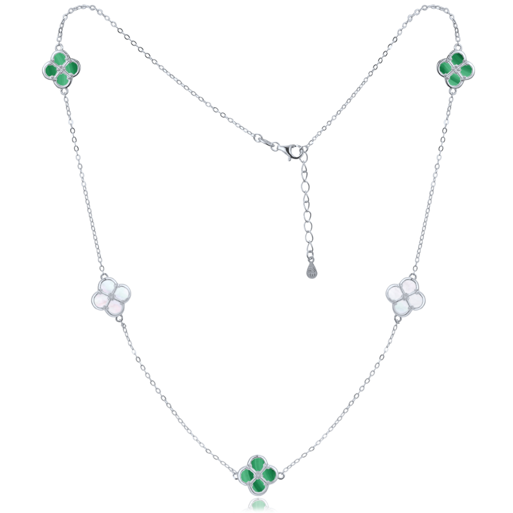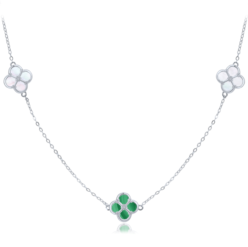 MINET Pozłacany srebrny naszyjnik koniczynkami z białą masą perłową i malachitem