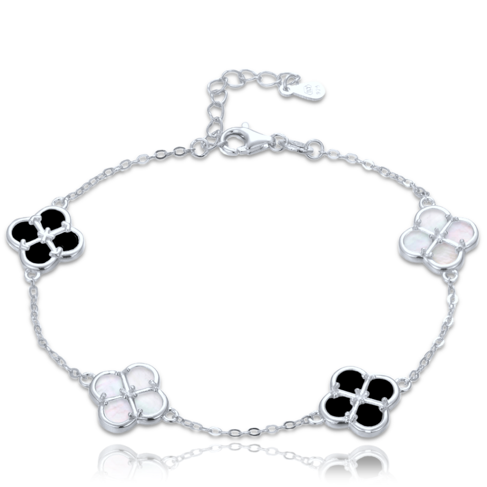 MINET Srebrna bransoletka koniczyna z białą i czarną masą perłową