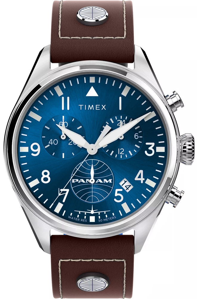 Model TIMEX Waterbuty z funkcją chronografu łączy klasyczną estetykę zegarka lotniczego z kopertą ze stali nierdzewnej o średnicy 42 mm – jedną z najbardziej rozpoznawalnych w ofercie tej marki. Niebieskie elementy w zegarku takie jak granatowa tarcza, wewnętrzny niebieski pasek i precyzyjne detale to celowy ukłon w stronę identyfikacji wizualnej lini lotnicznych Pan Am, który mocno nawiązuje do estetyki lat 60. i 70., kiedy Pan Am przeżywał swoje złote lata. Modele z tej serii charakteryzują się designem vintage oraz solidną konstrukcją, wykorzystując stal nierdzewną, skórzany pasek oraz szkło mineralne. Każdy zegarek z kolekcji i precyzyjne detale Timex x Pan Am® dostarczany jest w wyjątkowym, kolekcjonerskim opakowaniu inspirowanym autentycznymi naklejkami bagażowym oraz z kolekcjonerską przypinką tych lini lotniczych.