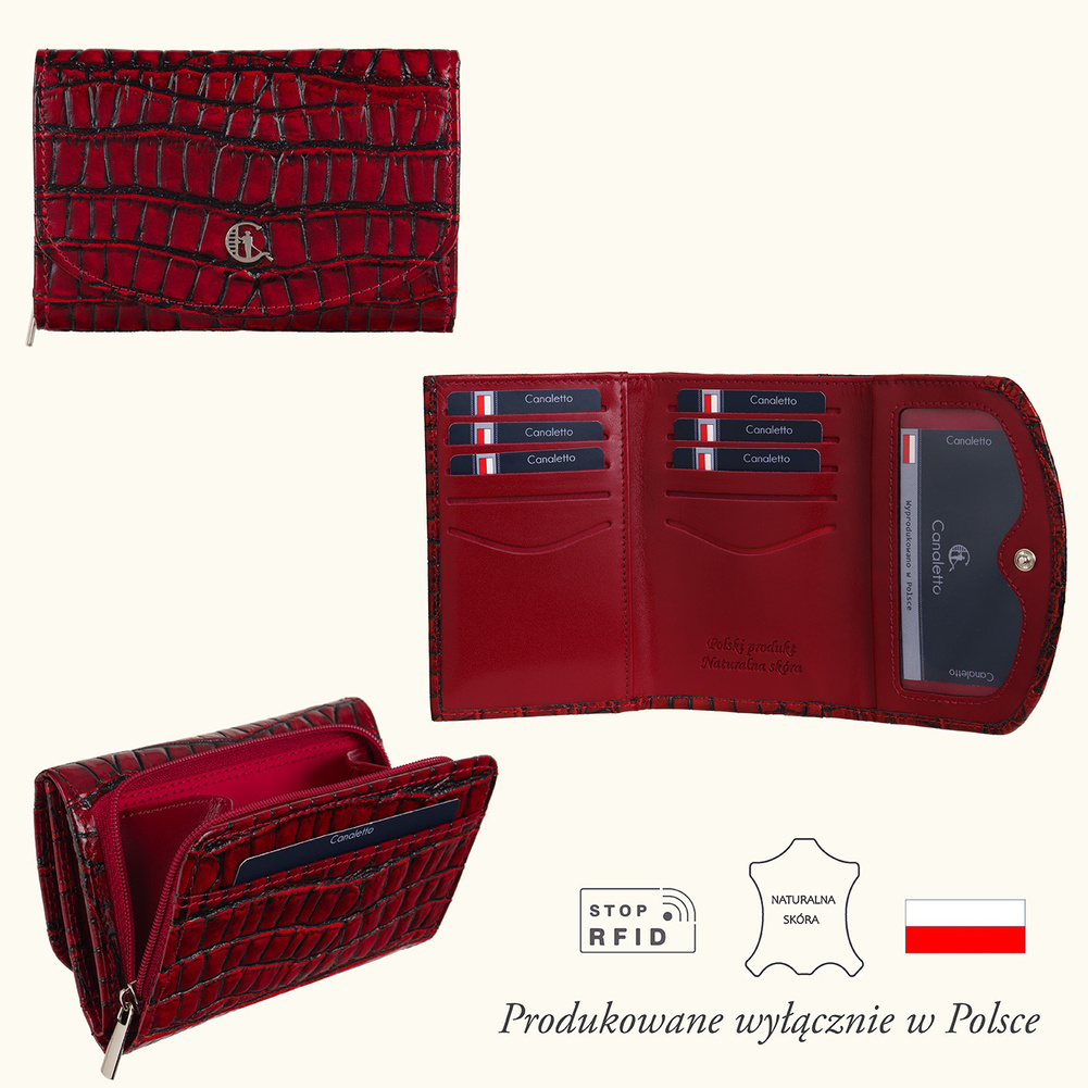 - Elegancki damski portfel ze skóry tłoczonej na wzór krokodyla. Styl, funkcjonalność i ochrona RFID w jednym – wybierz jakość od Canaletto.