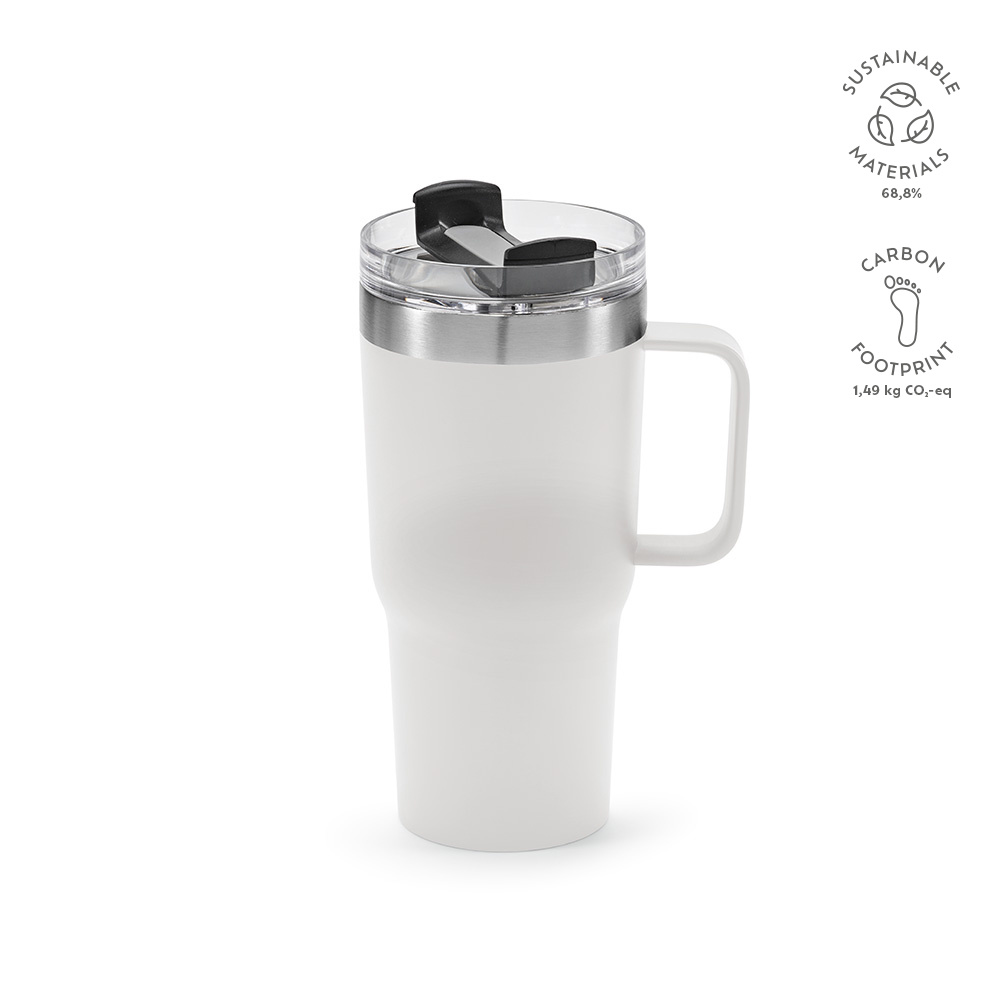 Orzeźwiające łyki z naszego kubka o pojemności 580 ml (490 ml netto). Recyklingowana stal nierdzewna i podwójne ścianki izolacyjne utrzymują napoje w idealnym stanie. Obrotowa pokrywka dopełnia całości, a kubek można myć w zmywarce. Od pracy do podróży, popijaj w sposób zrównoważony i stylowy.