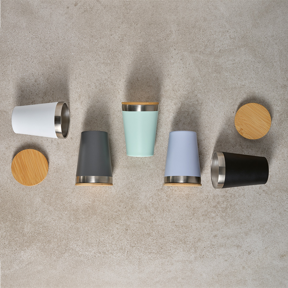 Wzbogać swoje łyki dzięki naszemu kubkowi podróżnemu o pojemności 390 ml (320 ml netto) ze stali nierdzewnej pochodzącej z recyklingu, który będzie Twoim ulubieńcem. Ma podwójne ścianki izolacyjne zapewniające idealną temperaturę napoju. Bambusowa pokrywka dodaje naturalnego akcentu. Pij w sposób przyjazny środowisku.