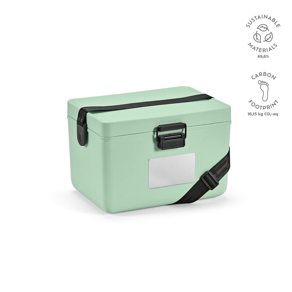 Plastikowa lodówka 12L z recyklingu: Trwała, przyjazna dla środowiska, z poręcznym paskiem transportowym. Dostarczana z tabliczką (14 x 7 cm), na której można umieścić logo. Idealny do chłodzenia napojów w podróży, podczas biwakowania lub na plaży.