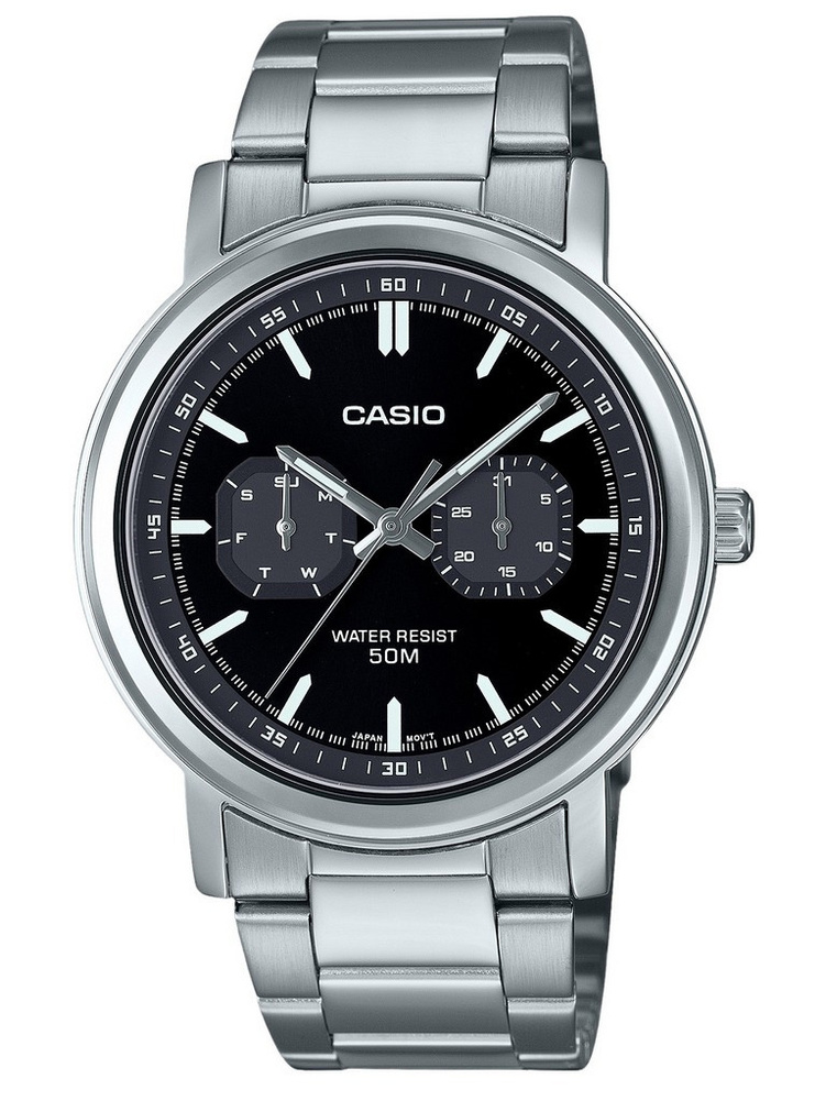 CASIO MTP-E335D-1E to zegarek, który doskonale łączy w sobie wytrzymałość i elegancję. Jego wodoszczelność do 50M sprawia, że jest odporny na zachlapania i krótkotrwałe zanurzenia w wodzie, co czyni go idealnym towarzyszem na co dzień – niezależnie od tego, czy jesteś w pracy, na spotkaniu z przyjaciółmi, czy podczas weekendowego relaksu. Wytrzymała bransoleta ze stali szlachetnej w srebrnym kolorze idealnie komponuje się z kopertą, tworząc spójną, harmonijną całość, która przyciąga wzrok swoją prostotą i klasą. Bransoleta ta nie tylko dodaje zegarkowi wyrafinowanego charakteru, ale także zapewnia komfort noszenia przez cały dzień, dzięki dopracowanemu systemowi zapięcia.