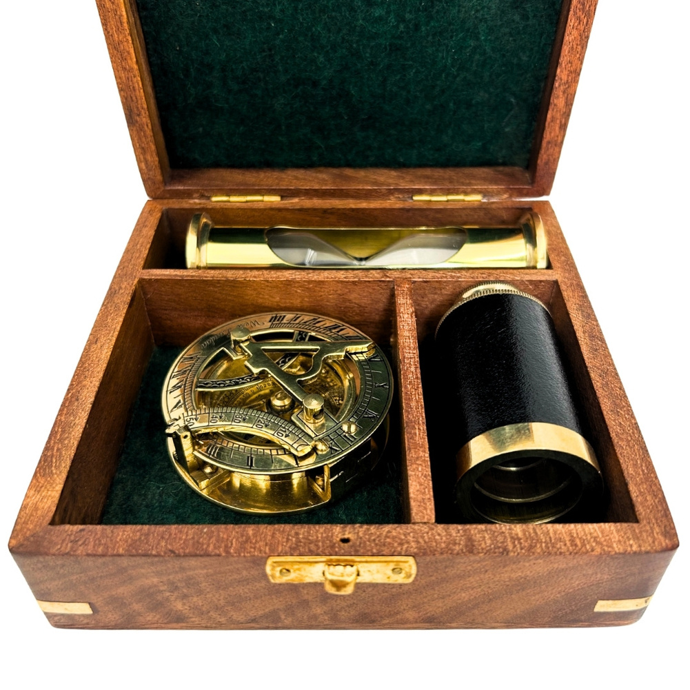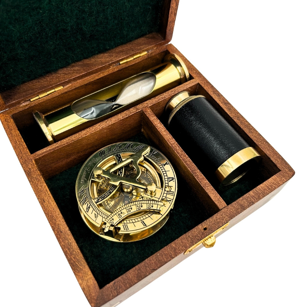 Szukasz wyjątkowego prezentu, który zachwyci miłośnika podróży, historii lub marynistyki? Ten elegancki zestaw retro to idealna propozycja! Komplet zawiera trzy stylizowane instrumenty: mosiężny kompas z zegarem słonecznym, lunetę retro oraz klepsydrę, a wszystko zamknięte jest w solidnym, drewnianym pudełku.