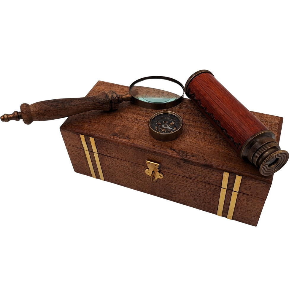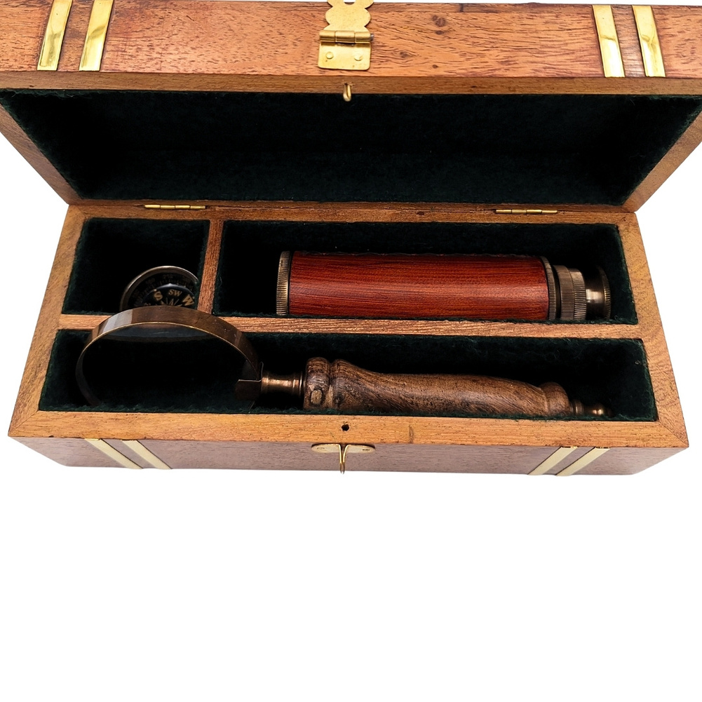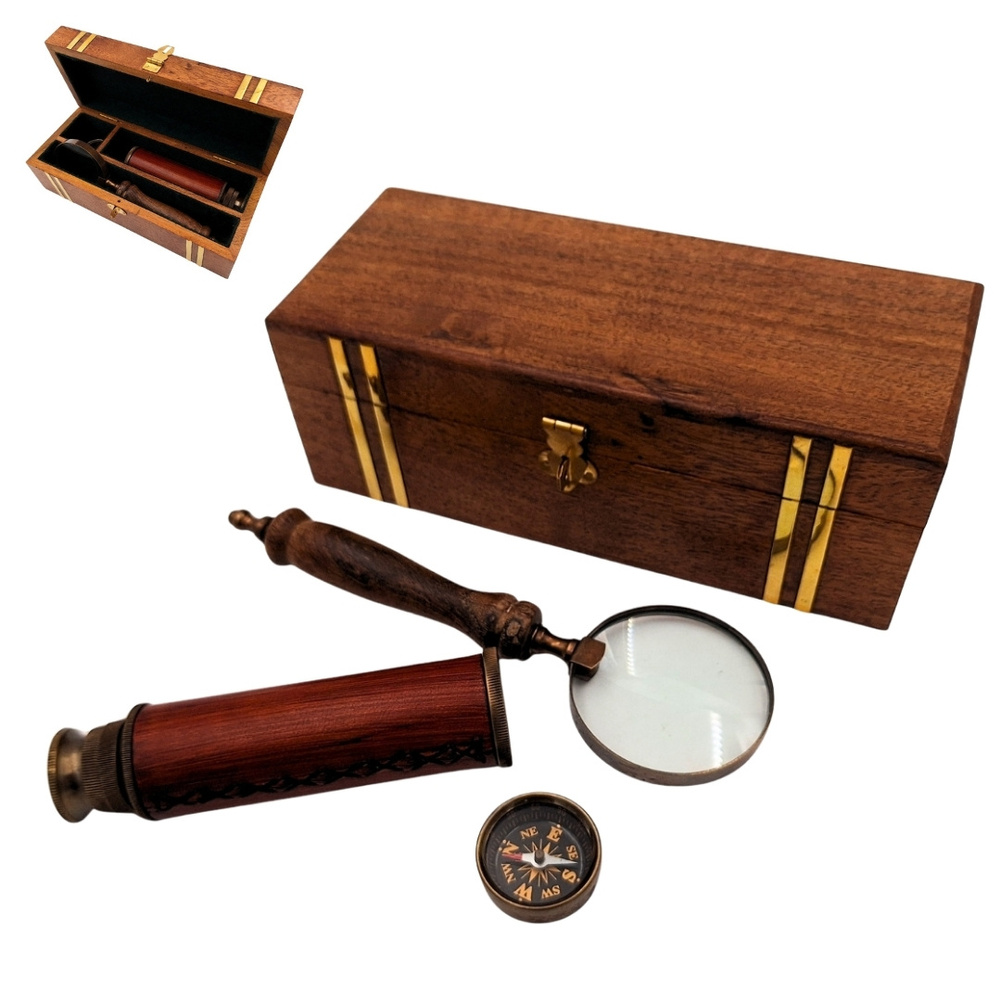 Zestaw Podróżnika Retro - Kompas + Luneta + Lupa w Pudełku Drewnianym - NC102369