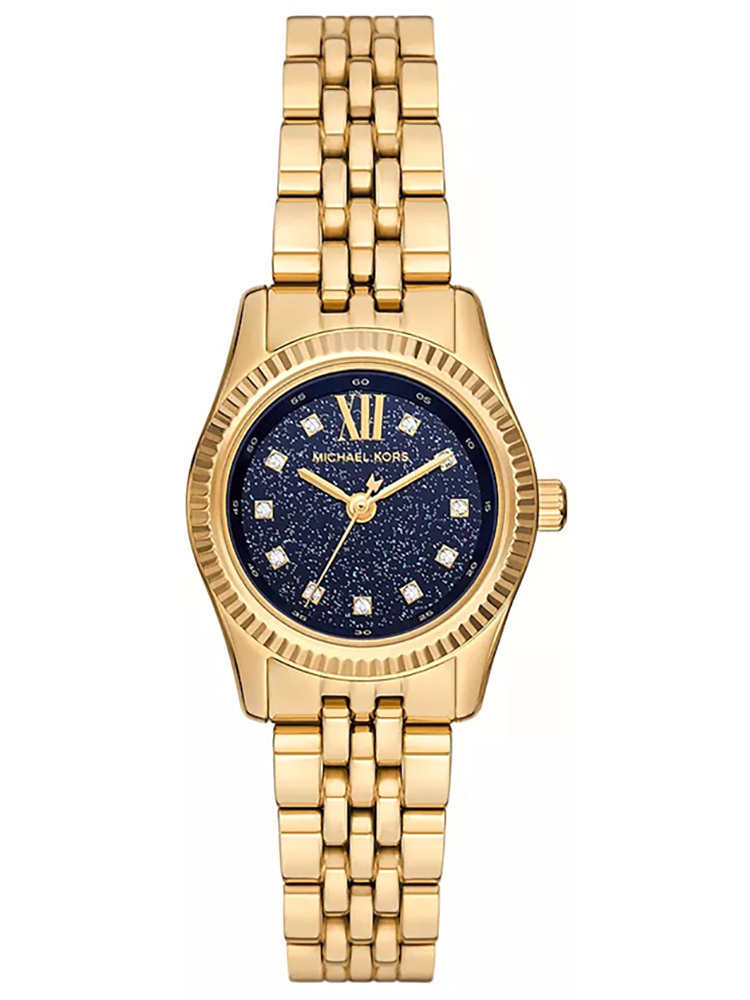 Zegarek Michael Kors MK4802 Lexington to bardzo efektowny i kobiecy dodatek zarówno do sportowych jak i casualowych stylizacji. Tarcza zegarka zdobiona cyrkoniami i drobinkami złotego brokatu - całość zachowana w kolorze granatowym. Koperta i bransoleta wykonana ze stali szlachetnej w kolorze złotym. Zastosowane szkło mineralne, które gwarantuję ochronę przed pęknięciami. Zegarek posiada szczelność na poziomie 50 m co oznacza, że jest odporny na zachlapanie np. podczas mycia rąk.