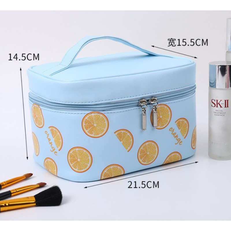 Piękna, damska rozkładana kosmetyczka, dostępna w kolorze niebieskim z pomarańczami Wykonana z miękkiego, śliskiego materiału.